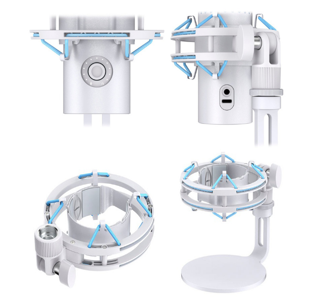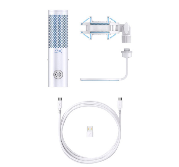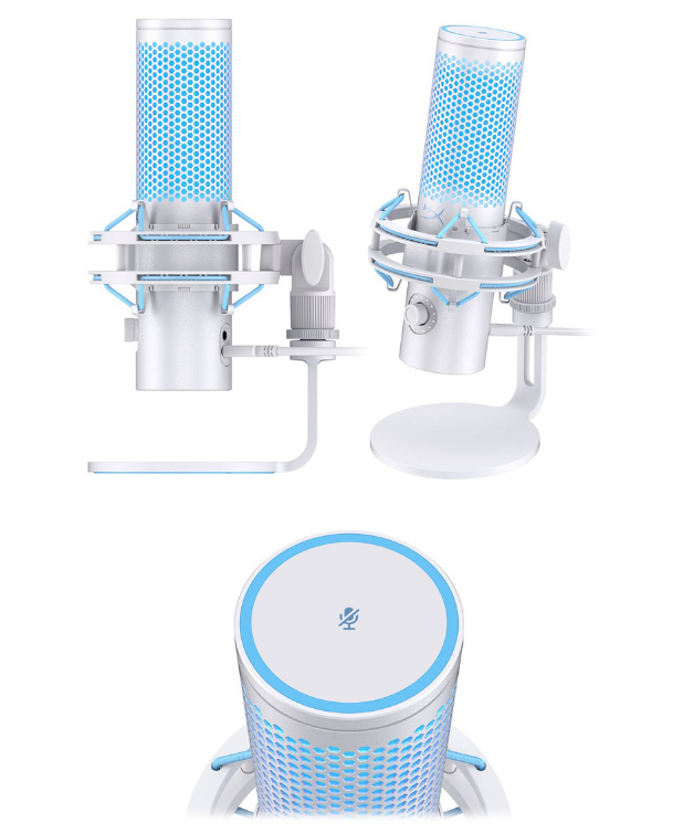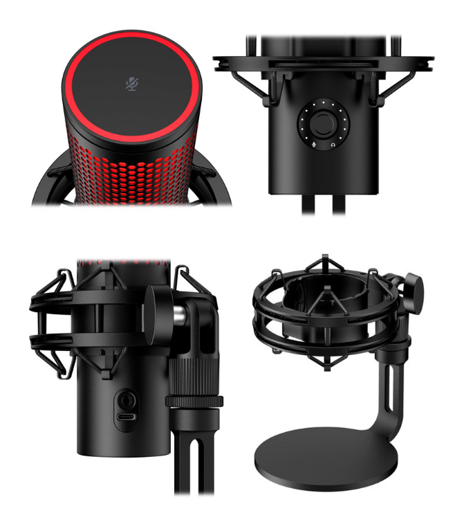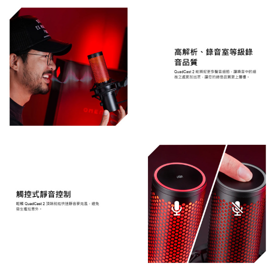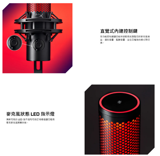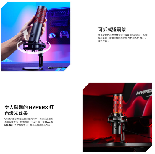 可拆式避震架 HyperX 紅色燈光效果 麥克風狀態 LED 指示燈 高解析、錄音室等級錄音品質 可在 HyperX NGENUITY 軟體中自訂 觸控式靜音控制,直覺式內建控制鍵 四種指向性模式:心形、全向性、雙指向、立體聲