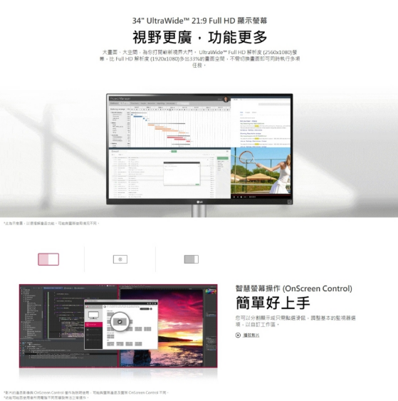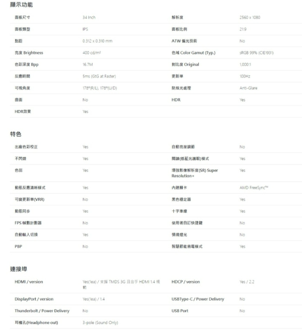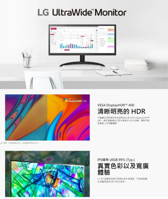 UltraWide™ 21:9 sRGB 99% 色域 AMD FreeSync 100Hz 更新率 傾斜可調支架