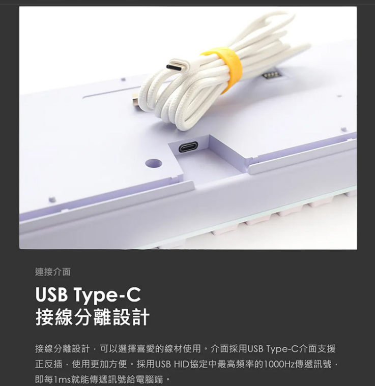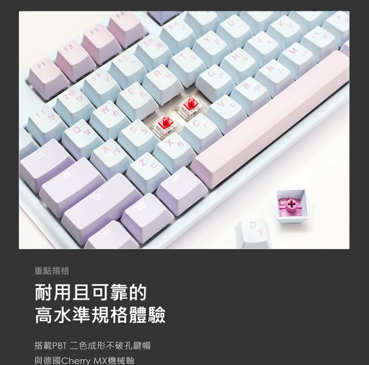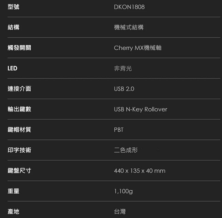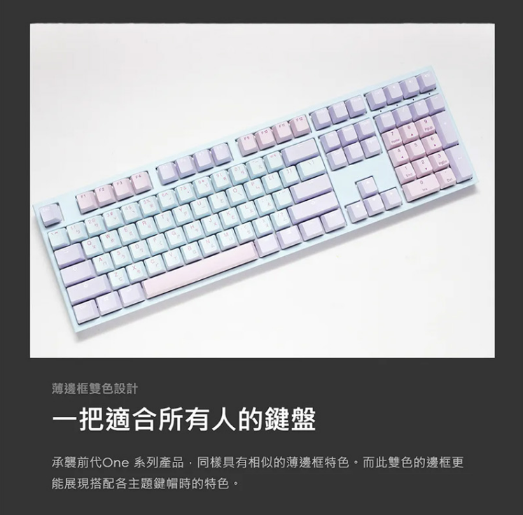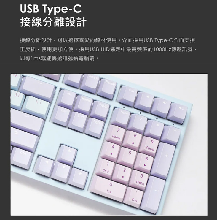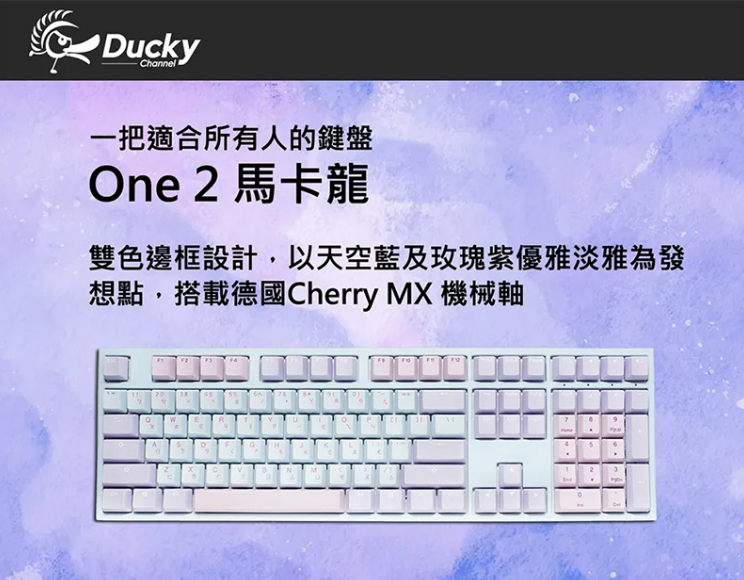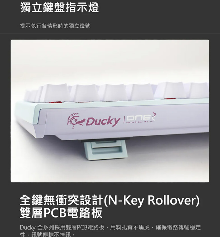 1、全新配色設計 2、多段式腳架設計 3、獨立指示燈設計 4、雙層電路板用料 5、台灣設計,台灣製造 6、PBT二色成形不破孔鍵帽 7、使用德國Cherry MX機械軸 8、USB Type -C接頭與線分離設計 9、Ducky Macro 2.0 ,最強大的硬體設定功能