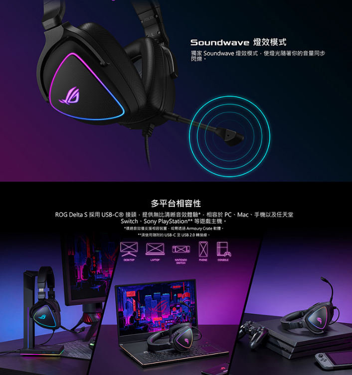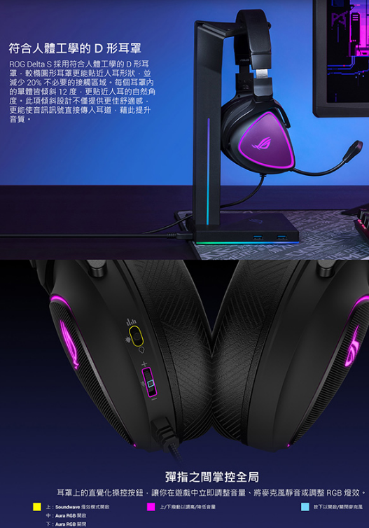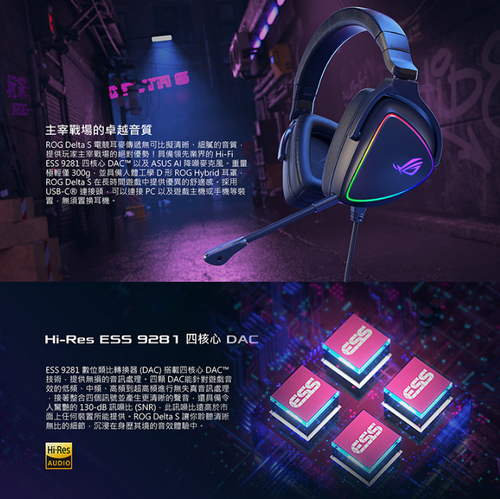 ASUS AI降噪麥克風 HI-RES ESS Quad-DAC USB-C接頭支援多平台 可自訂的環狀RGB燈效 獨家ASUS Essence單體 Audio Signal Diversion 技術 符合人體工學的D型ROG Hybrid 耳罩
