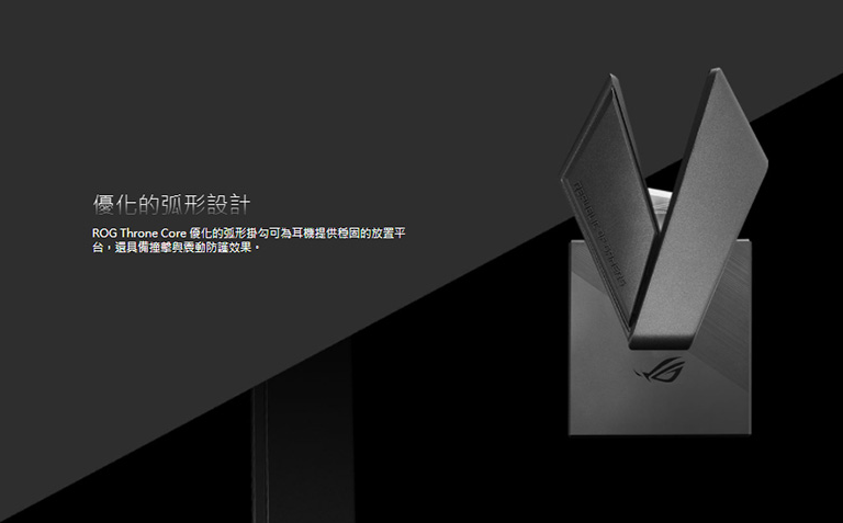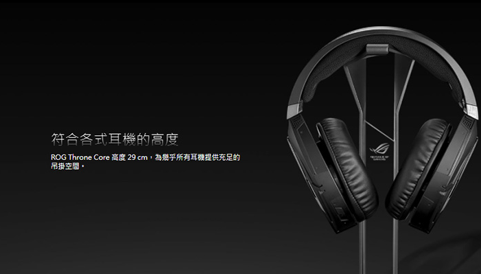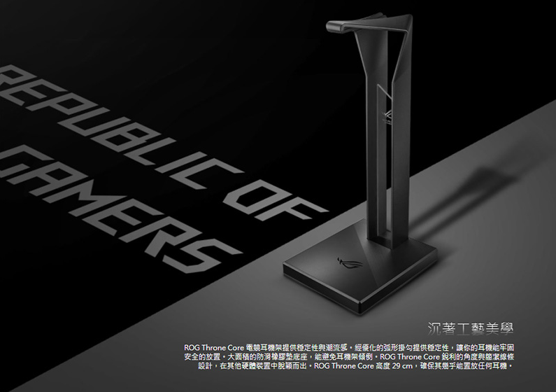 優化的弧形掛勾 銳利的角度與簡潔的線條設計 堅固防滑的大面積橡膠底座 ROG Throne Core 高度 29 cm