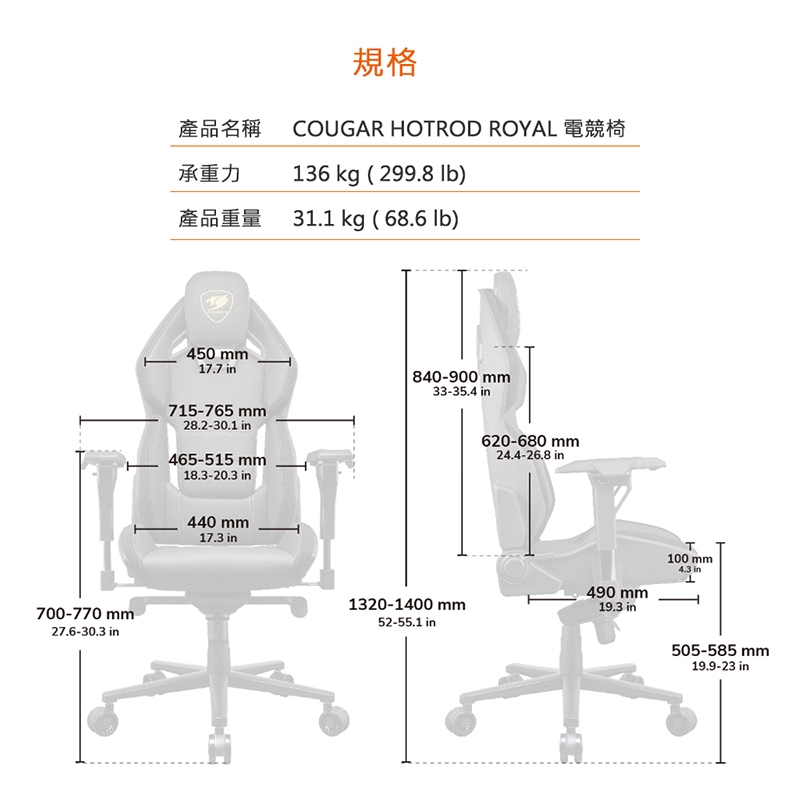 1. 3D 可調整扶手 2. Class 4 升降氣棒 3. 內置200mm RGB 風扇 4. 扇形弧度椅墊 5. PVC 皮革 6. 150º 椅背傾斜