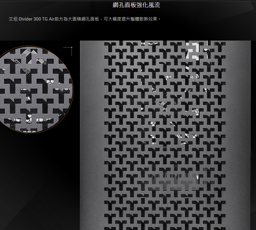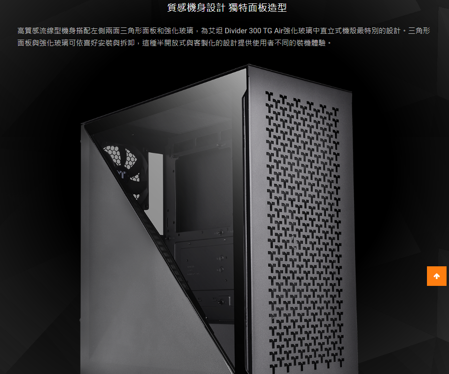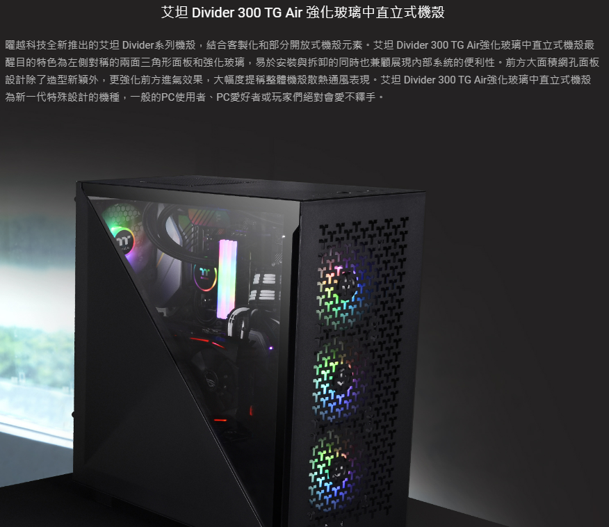 艾坦 Divider 300 TG Air強化玻璃中直立式機殼,內建兩顆120mm標準型風扇,一面3mm強化玻璃在左側,並支援至ATX主機板。