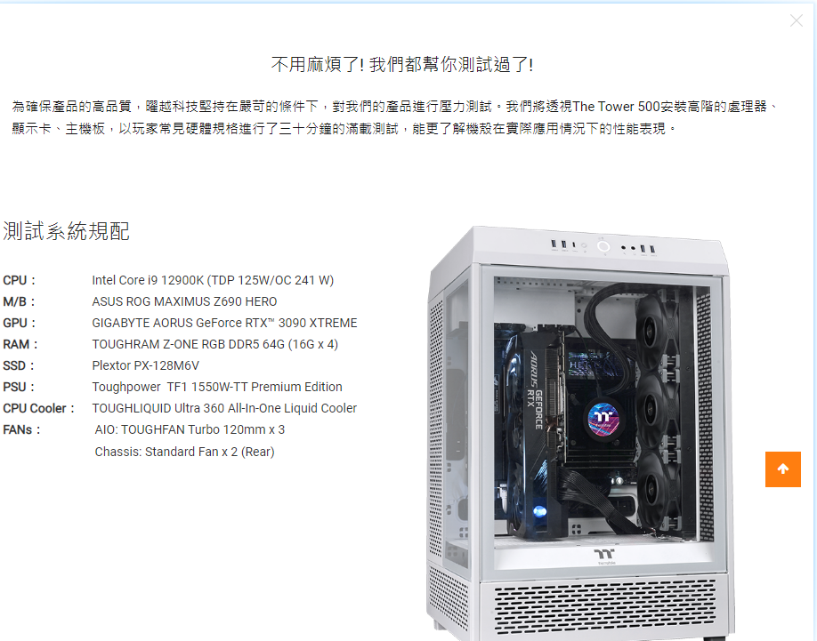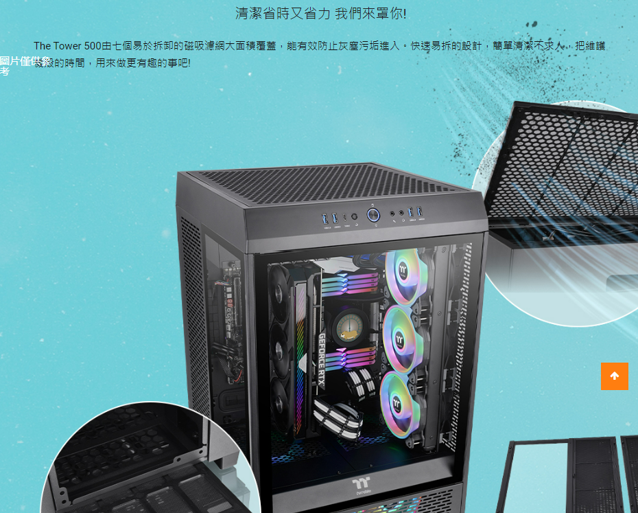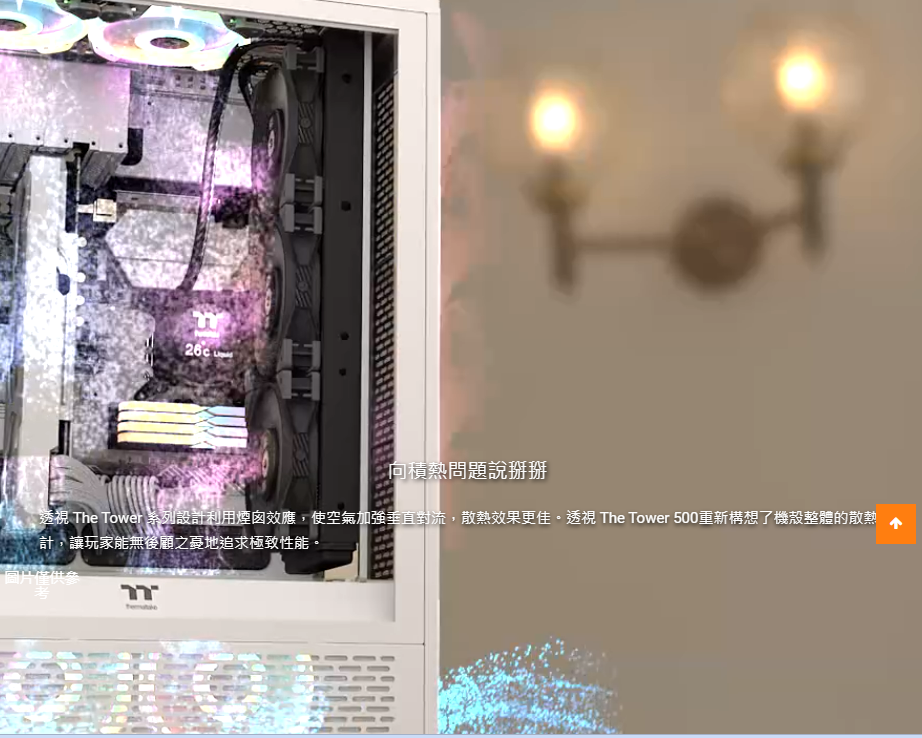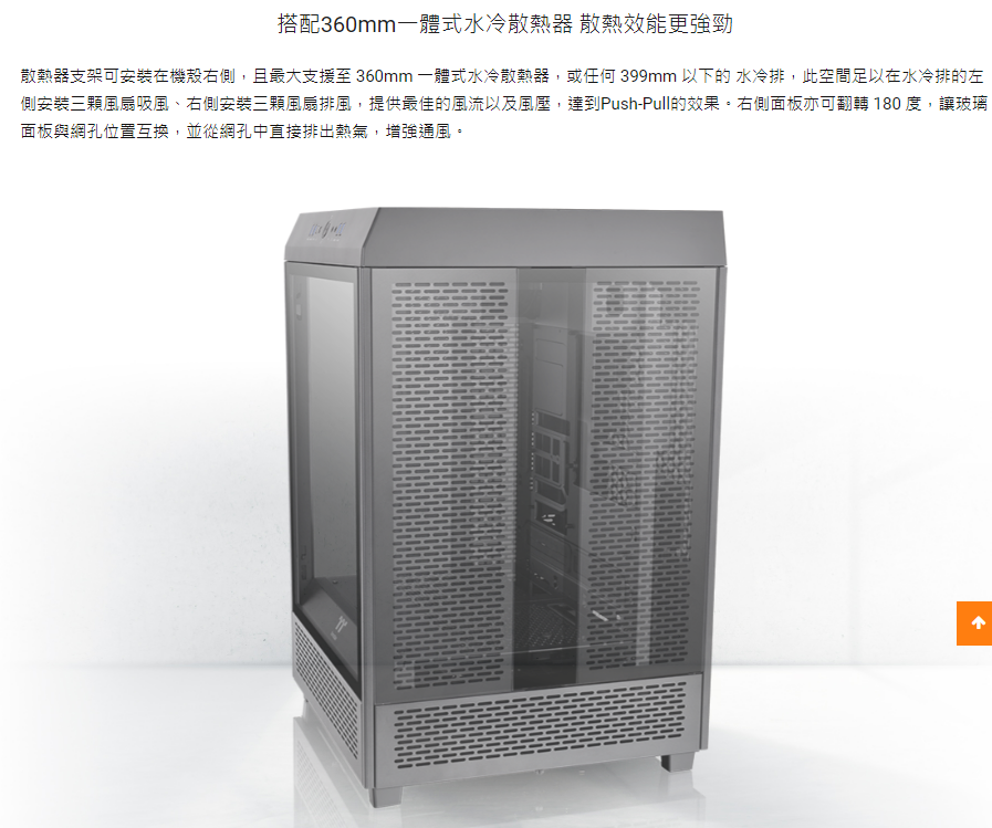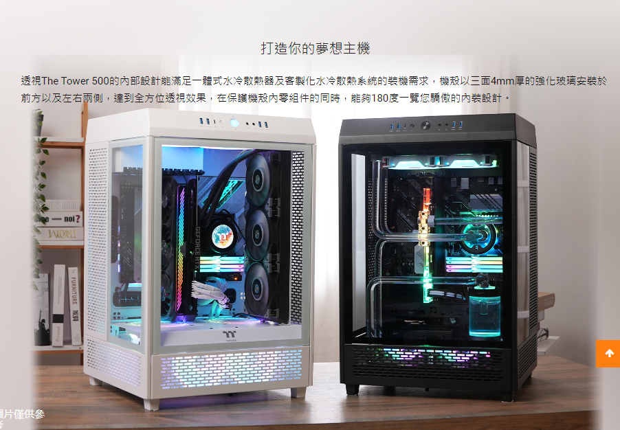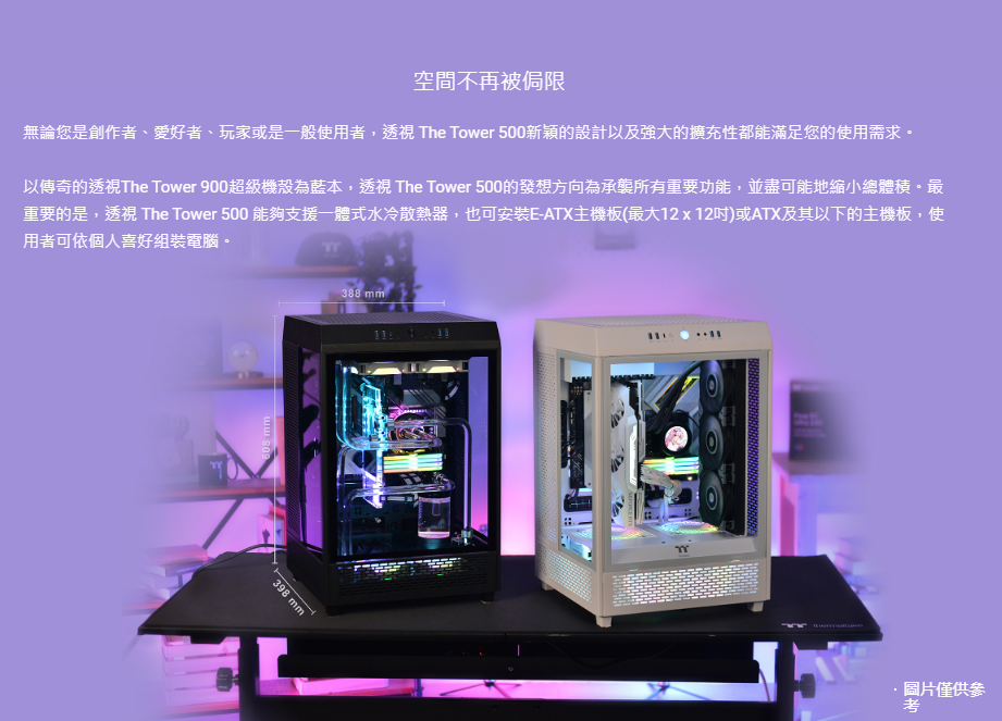 透視The Tower 500 雪白版是一台中直立式機殼,以三面4mm厚強化玻璃提供全景視野,機殼內配有兩顆120mm標準型風扇。此機殼可支援至12” x 12” E-ATX主機板,並容納各類高階硬體。同時也可搭配單獨販售的LCD液晶螢幕配件組,以配件組中的3.9吋LCD液晶螢幕來達到極致的視覺饗宴。