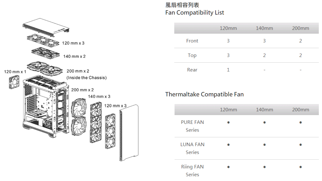 3 x 120mm, 2 x 140mm, 2 x 200mm