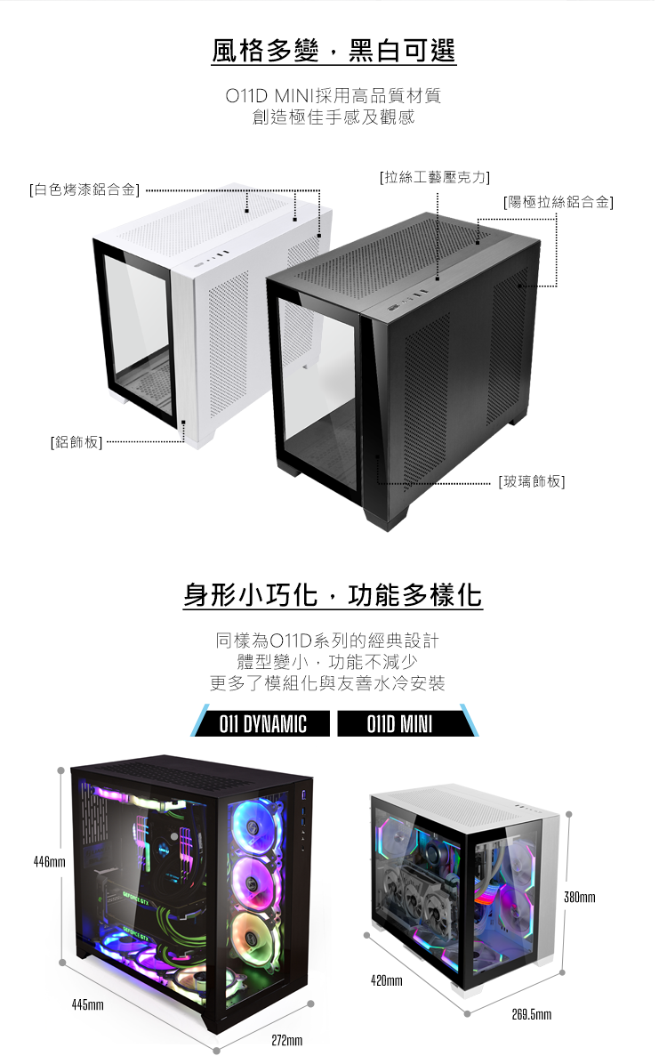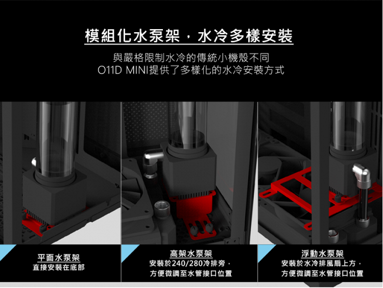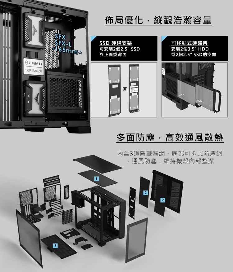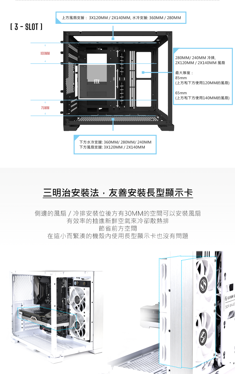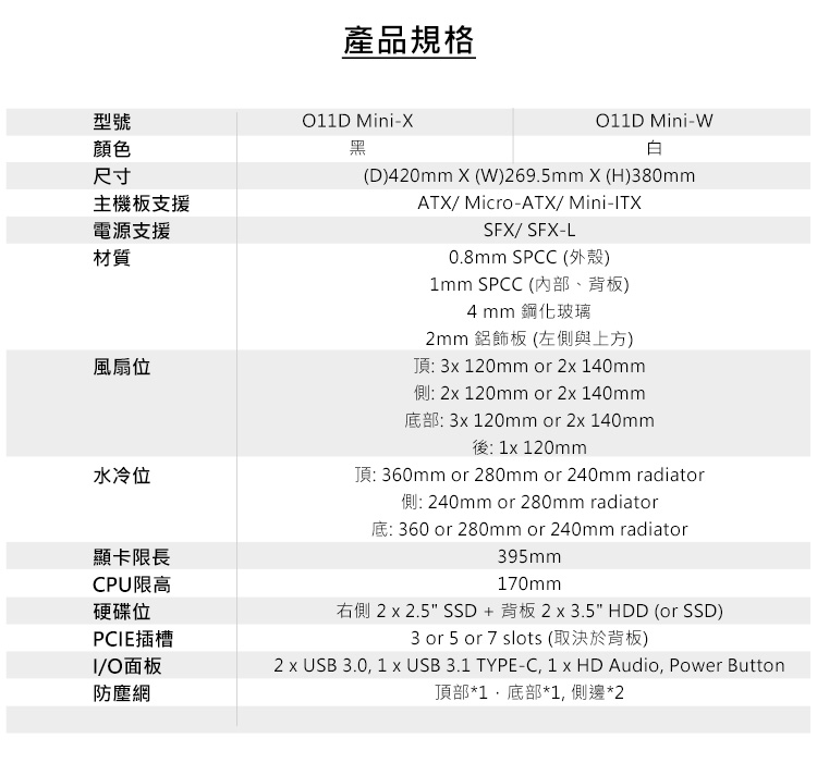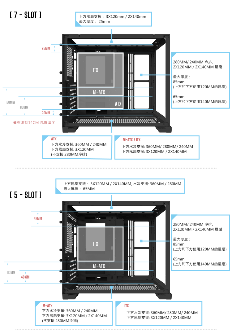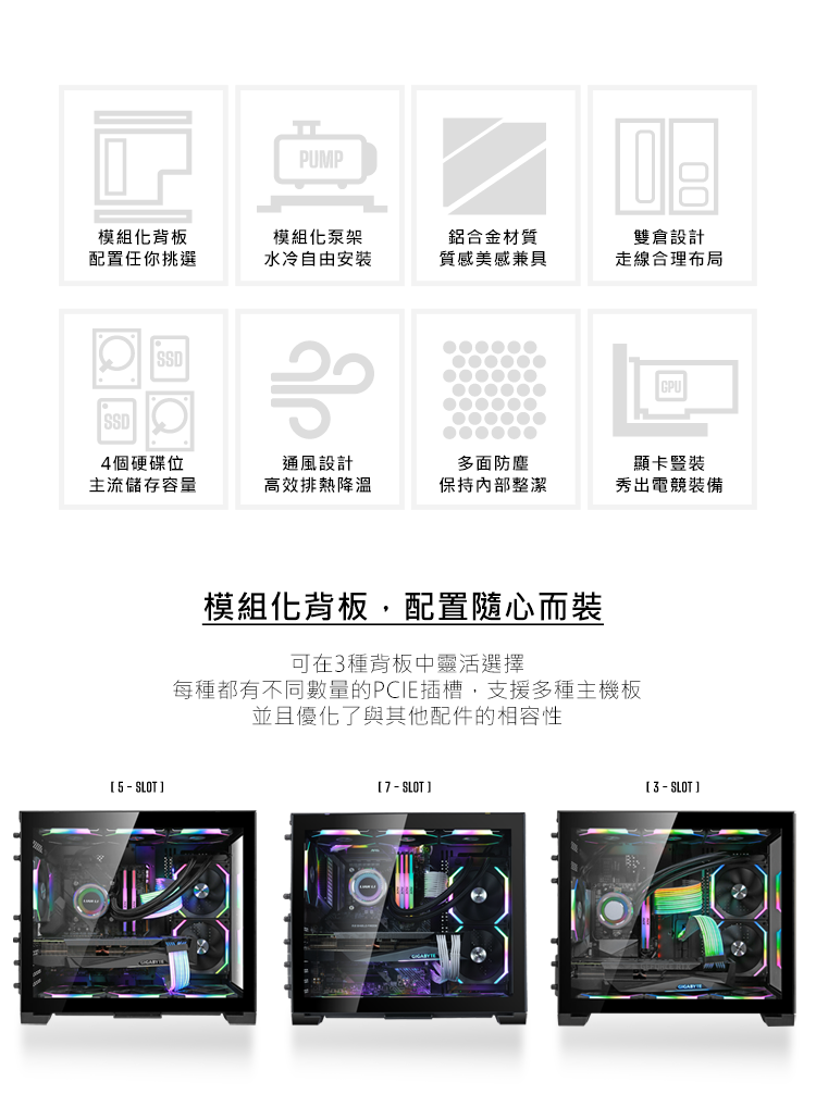 ★7個插槽配置,可以安裝ATX主板 ★5插槽配置,可以安裝Mini-ITX或Micro-ATX主板 ★3插槽配置,可以安裝完整尺寸的GPU和Mini-ITX主板 ★外觀為全鋁合金材質 ★4片抽取式防塵濾網 ★支持最長395mm的顯示卡 ★最多可容納9個120mm風扇 ★適用於SFX和SFX-L電源