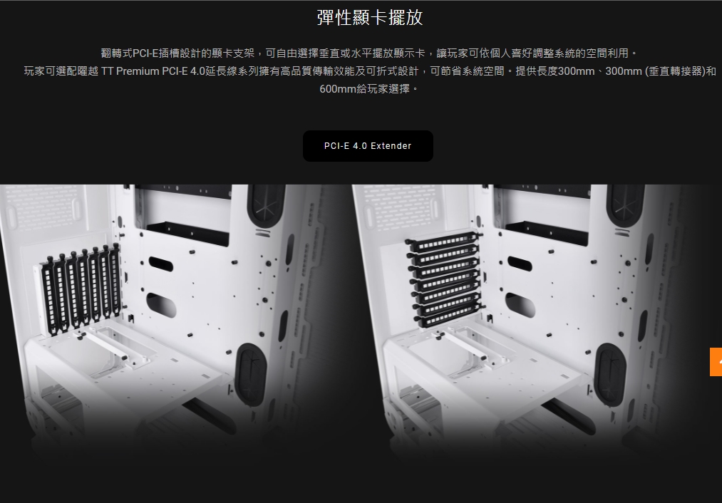 玩家可選配曜越 TT Premium PCI-E 4.0延長線系列擁有高品質傳輸效能及可折式設計,可節省系統空間。提供長度300mm、300mm (垂直轉接器)和600mm給玩家選擇。