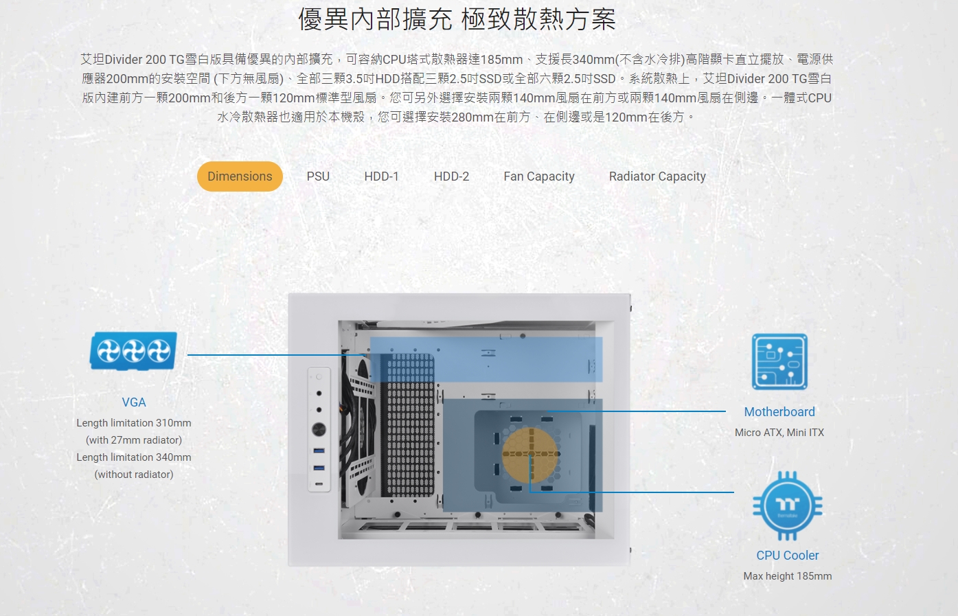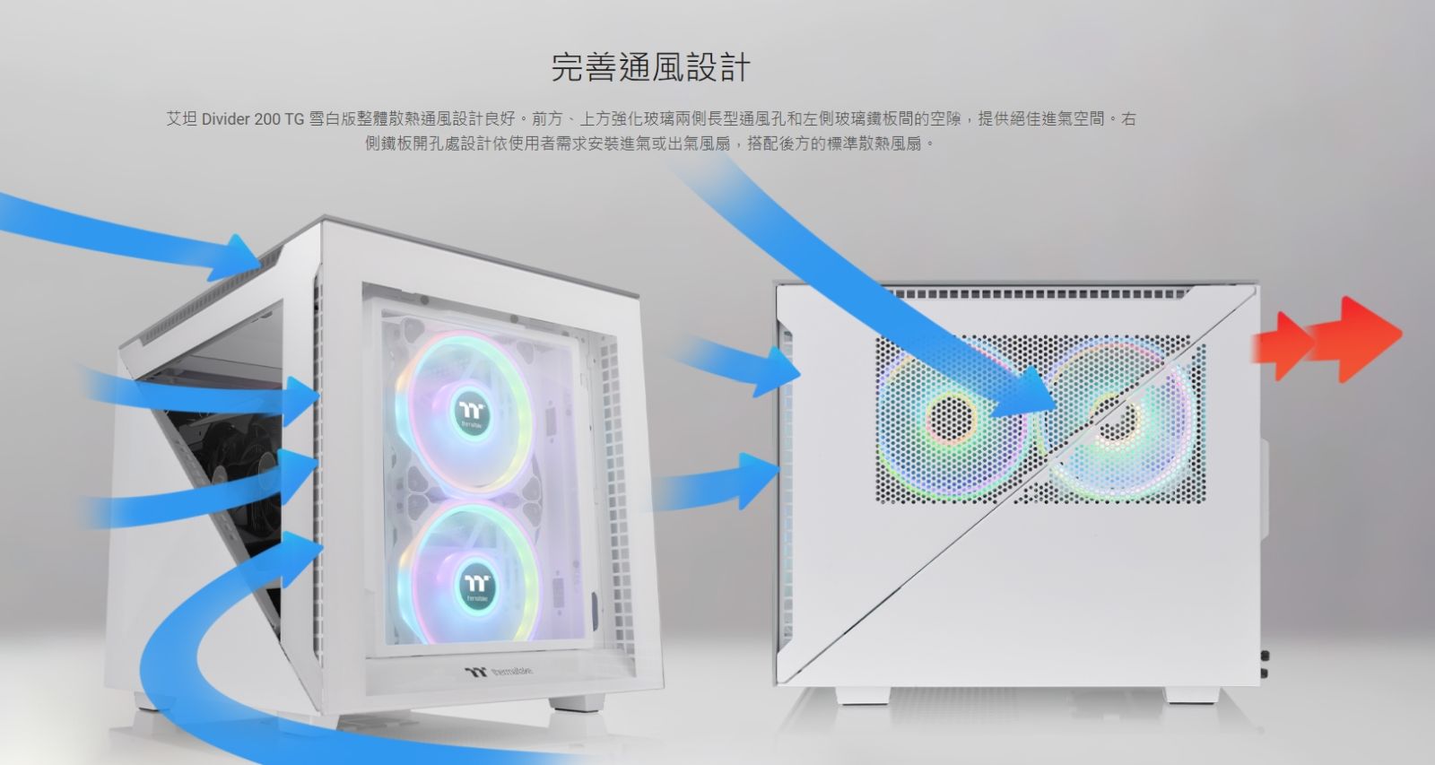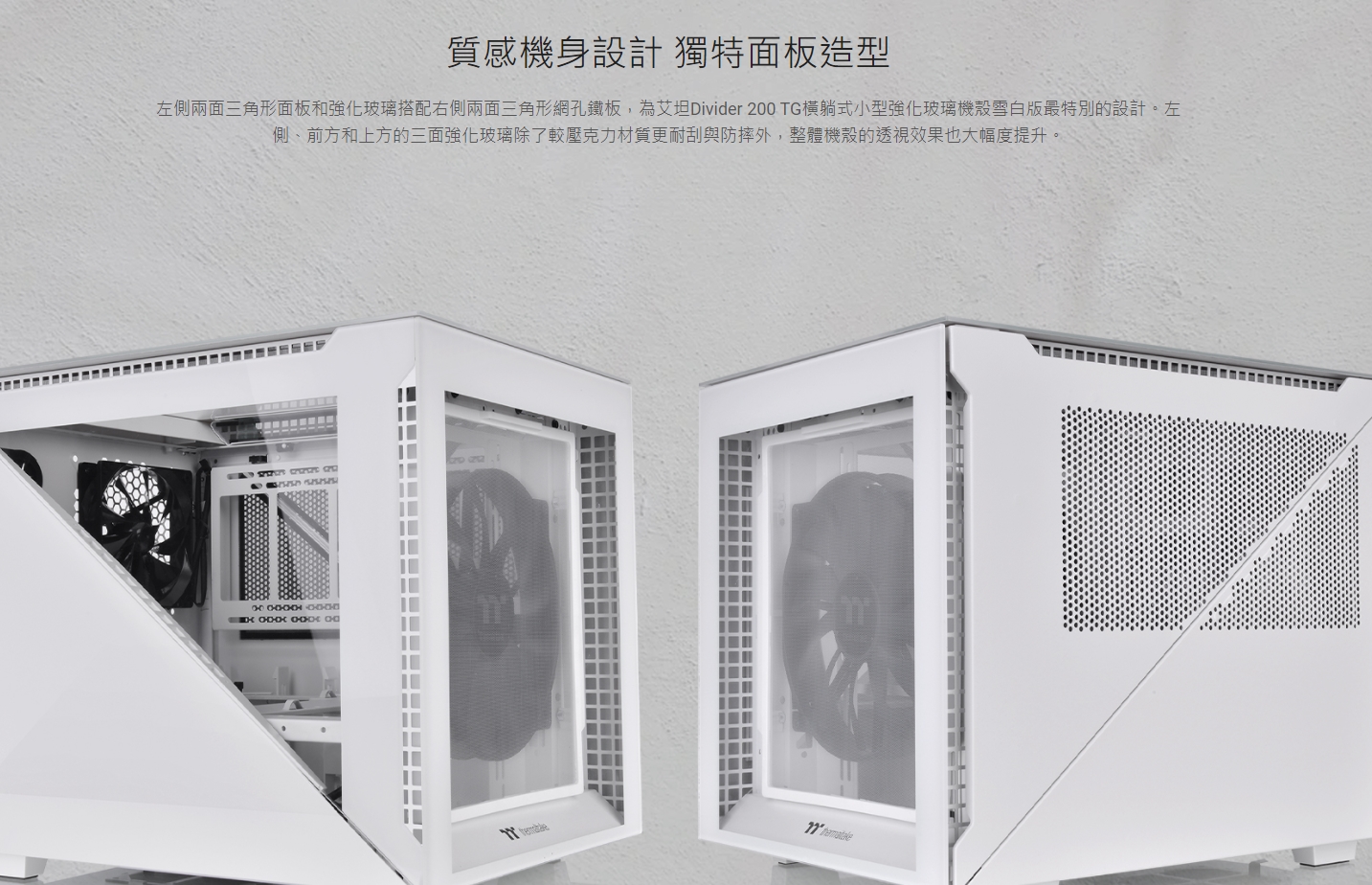 艾坦 Divider 200 TG 雪白版是一台Micro-ATX橫躺式小型強化玻璃機殼,內建前方一顆200mm和後方一顆120mm標準型風扇,三面3mm厚強化玻璃分別在正面、上方和左側。