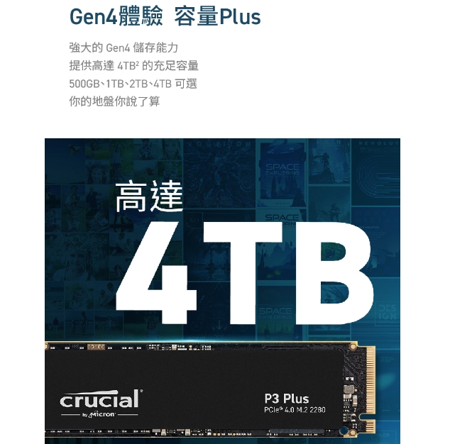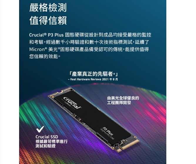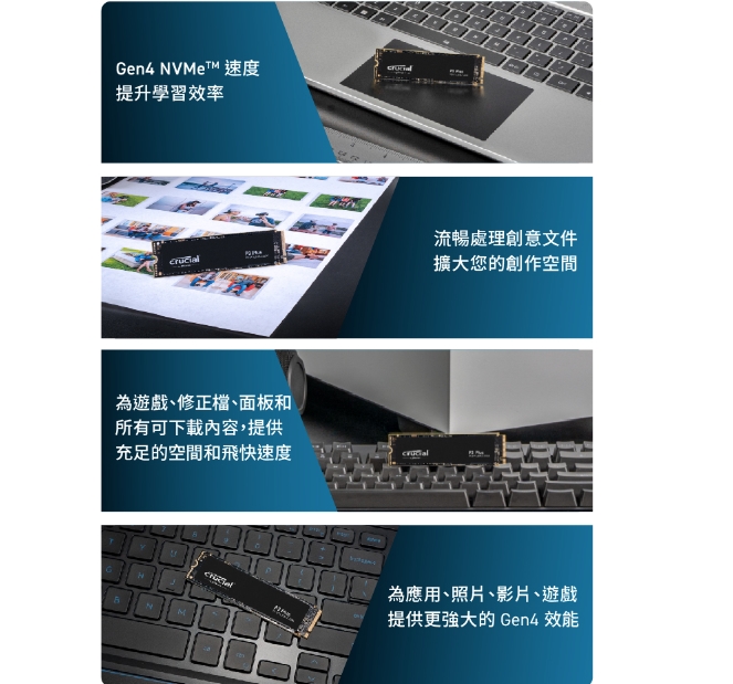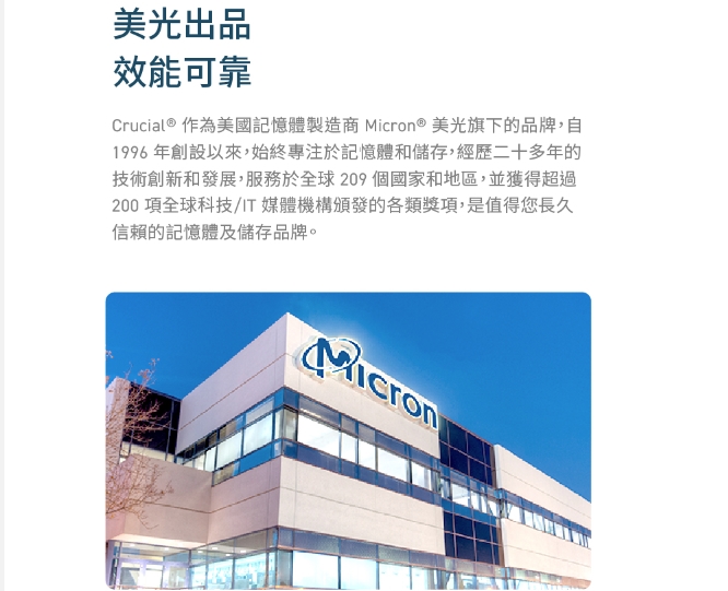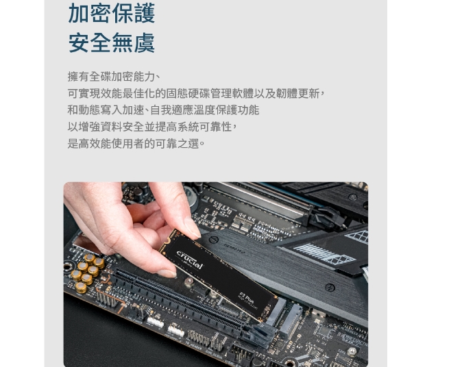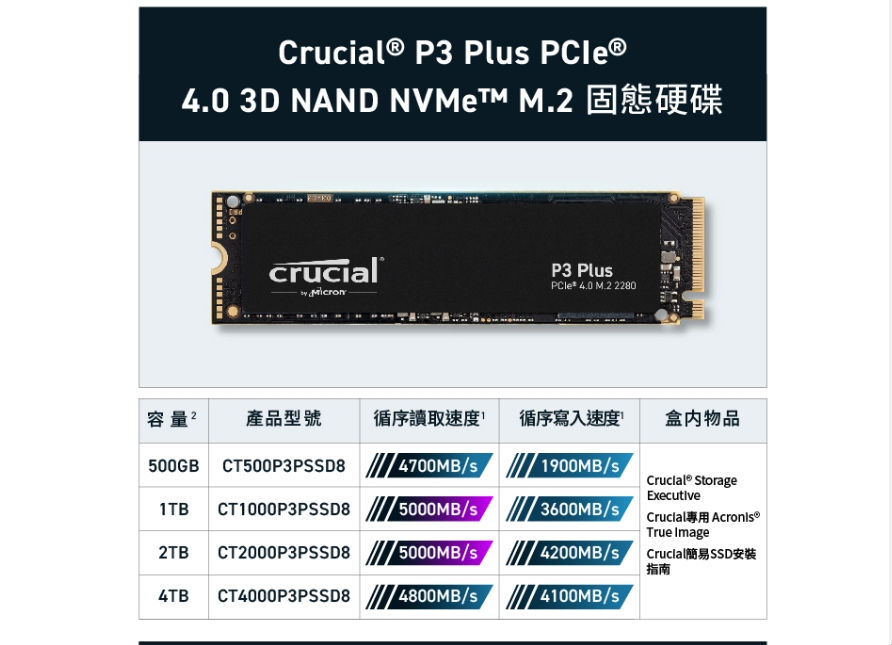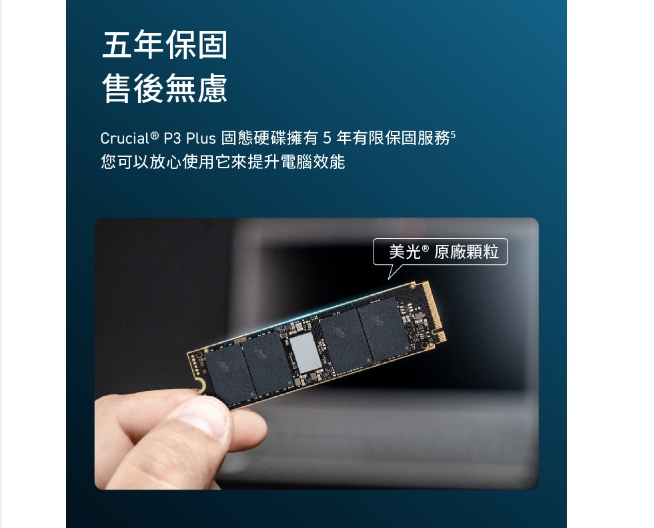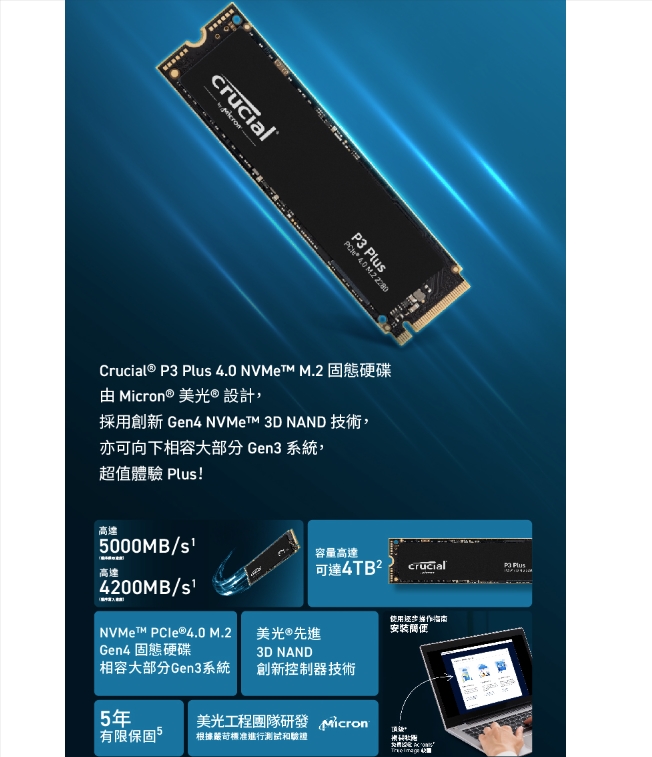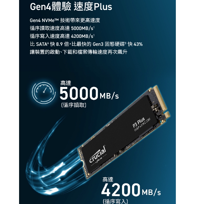 讀取5000MB/s;寫入4200MB/s;五年保 採用高品質的 Micron® 先進 3D NAND 打造 效能最佳化的 SSD 管理軟體和韌體更新(需下載)