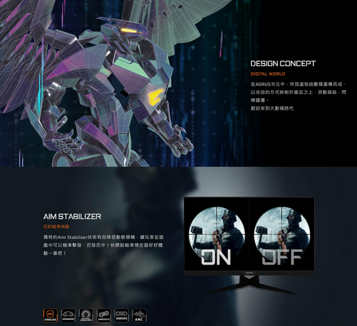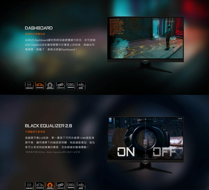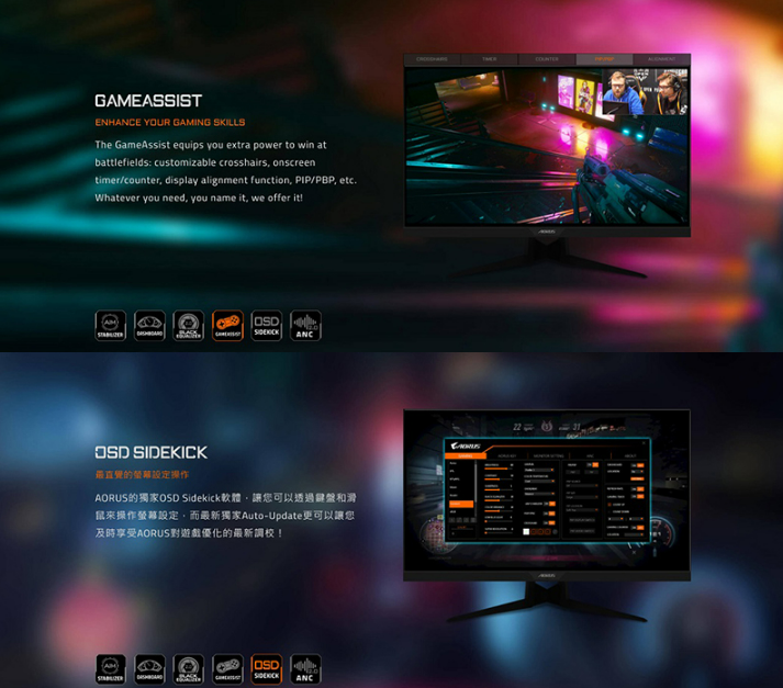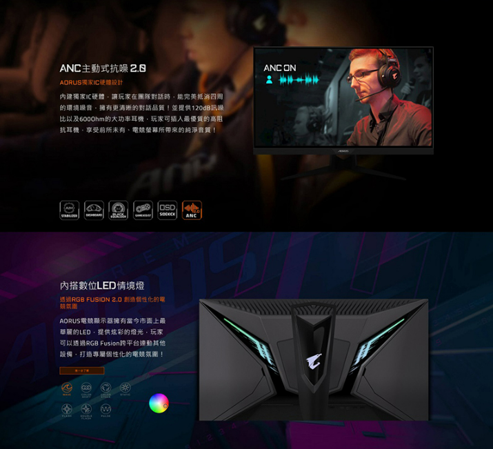 | 特殊功能 : | OSD Sidekick Active Noise Cancelling (ANC) 2.0 Aim Stabilizer Black Equalizer 2.0 Dashboard Crosshair Timer Counter PiP/PbP Auto-Update RGB Fusion 2.0 |