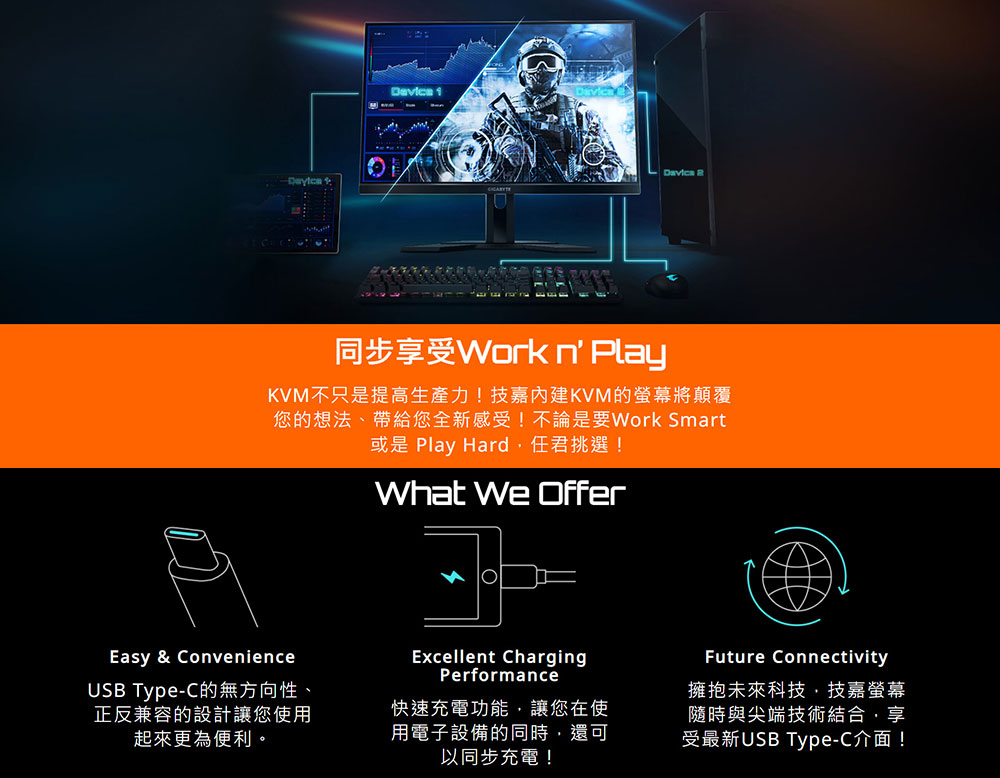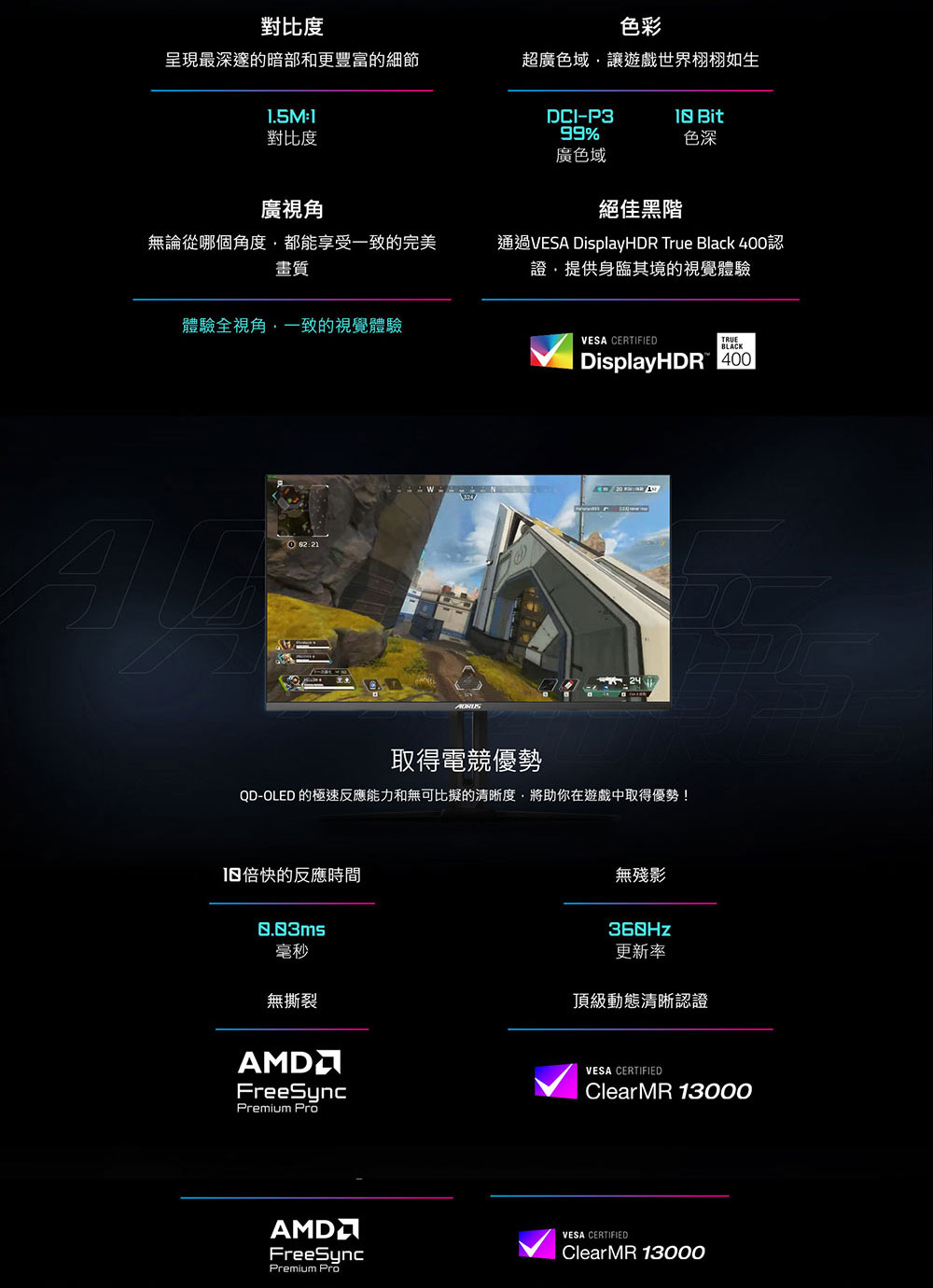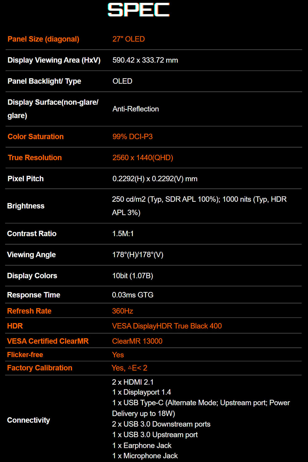 QD-OLED 面板 360Hz更新0.03ms反應 2560x1440 (QHD) HDMI/DP/USB-C介面 內建KVM切換器,可多重用戶端