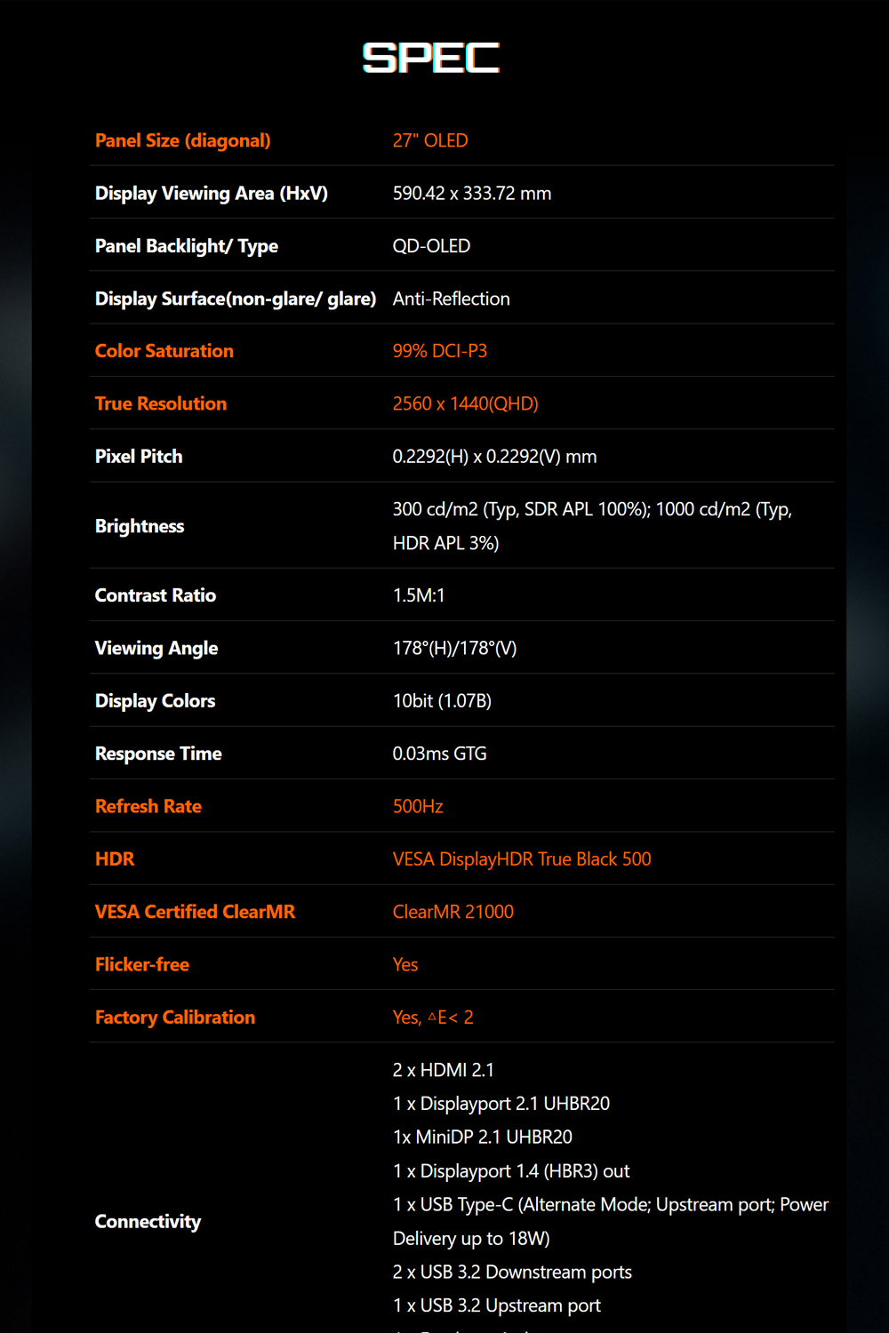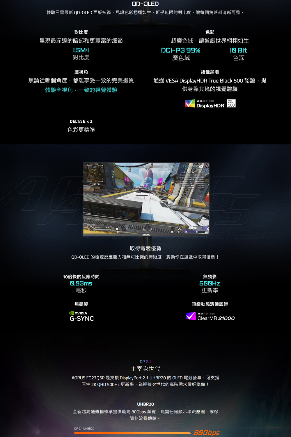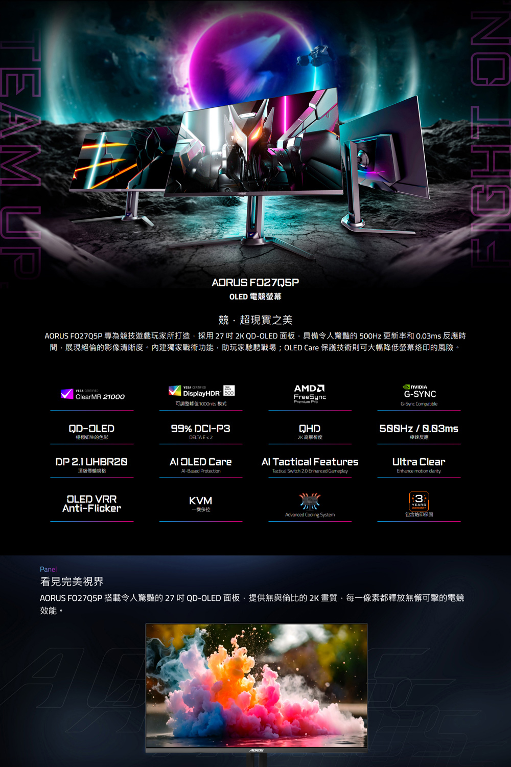 27 吋 QD-OLED面板 2560x1440(QHD) 500Hz 更新率 0.03ms 反應時間 全方位散熱系統