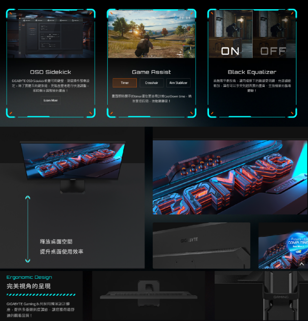 實用功能與設計:支援 OSD Sidekick、黑色均衡器與 PiP/PbP,搭配 VESA 壁掛。