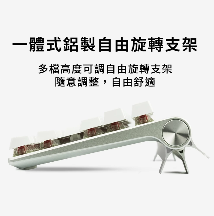 CNC陽極氧化全鋁機身,減輕重量、永不銹蝕、質感出眾。 80%布局設計,為滑鼠提供更多操作空間。 一體式鋁製自由旋轉支架,多檔高度可調自由旋轉支架,隨意調整、自由舒適 附鋁合金保護箱,最頂級的保護措施