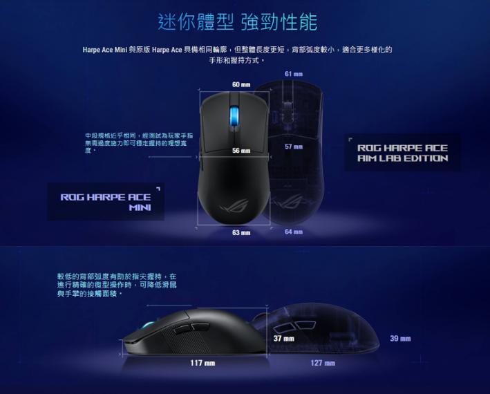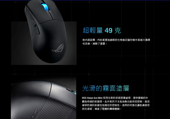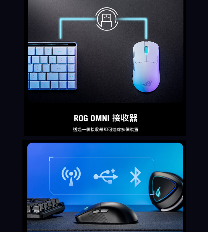 即時內建控制 ROG Paracord 和 100% PTFE 鼠腳 ROG Omni 接收器 超輕量 49 g 結構 ROG 光學微動開關 高速無線連接回饋