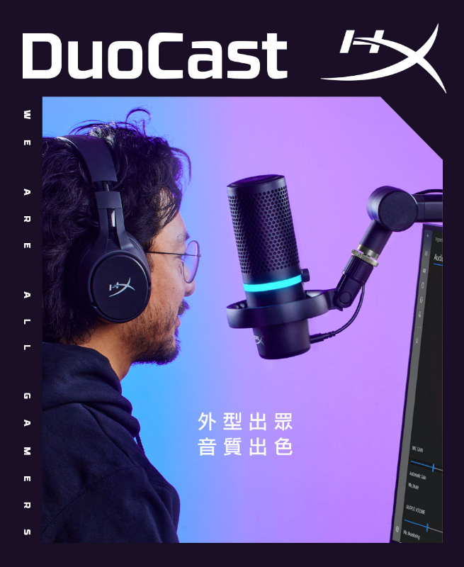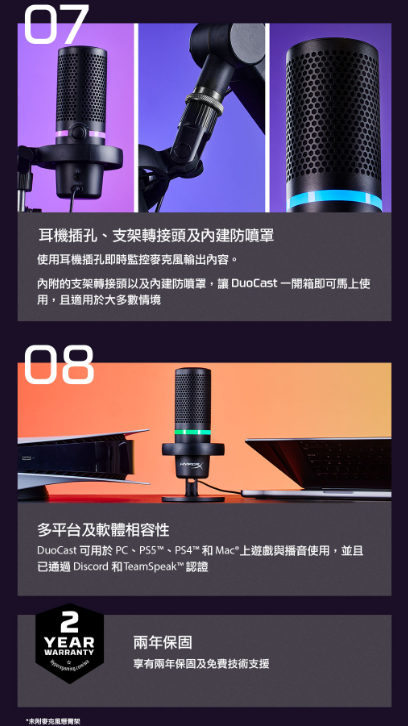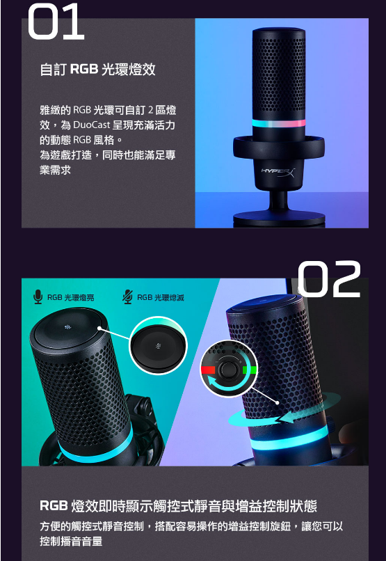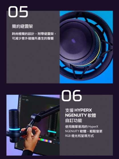 簡約避震架 兩種指向性型式 自訂RGB光環燈效 多平台及軟體相容性 Hi-Res 24-bit/96kHz 錄製 觸控式靜音與增益控制功能 耳機插孔、支架轉接頭、內建防噴罩 可透過 HYPERX NGENUITY 軟體自訂功能