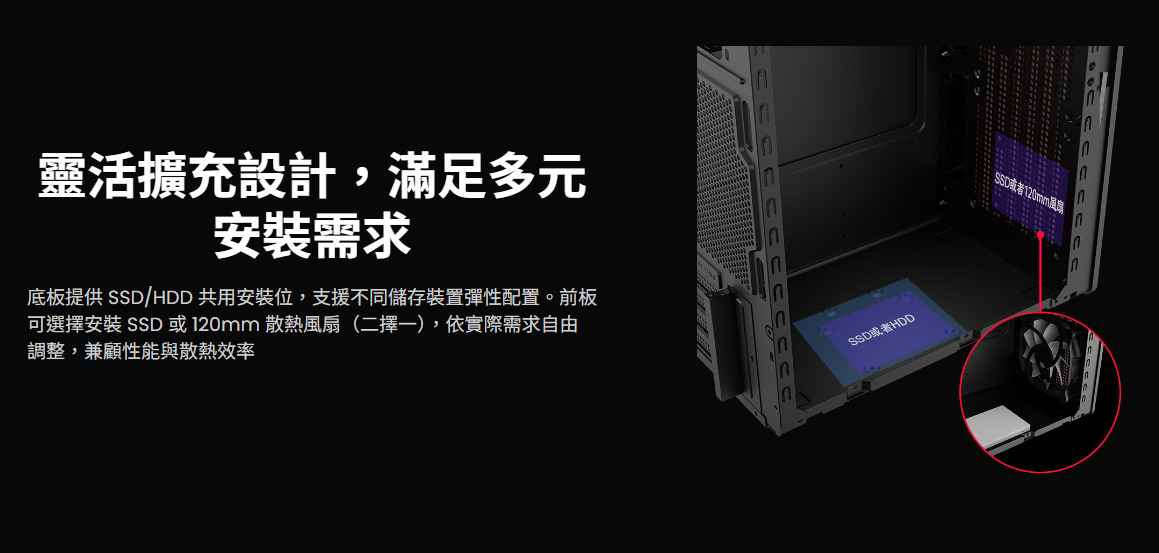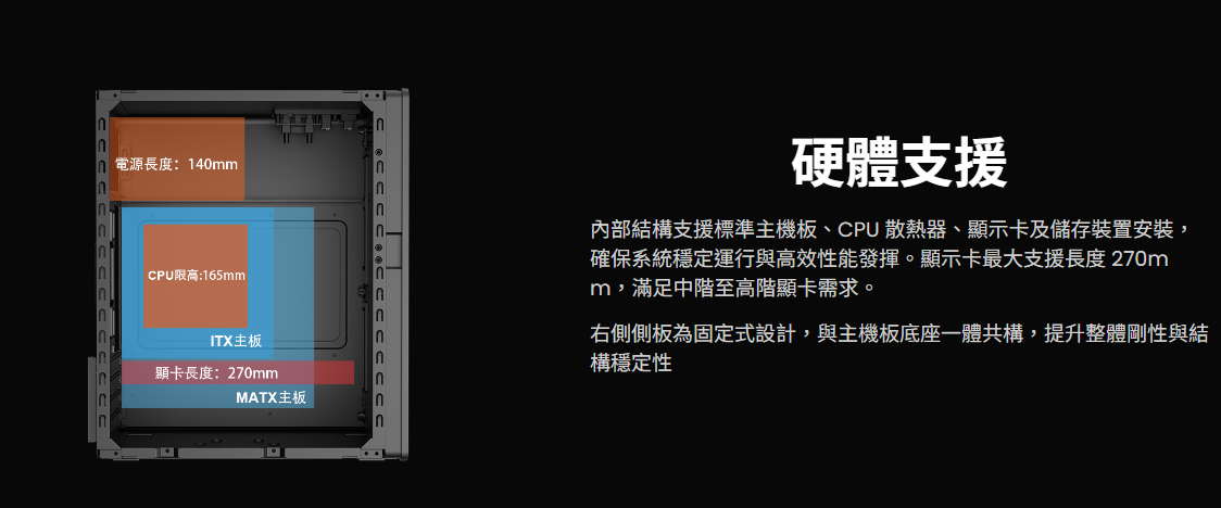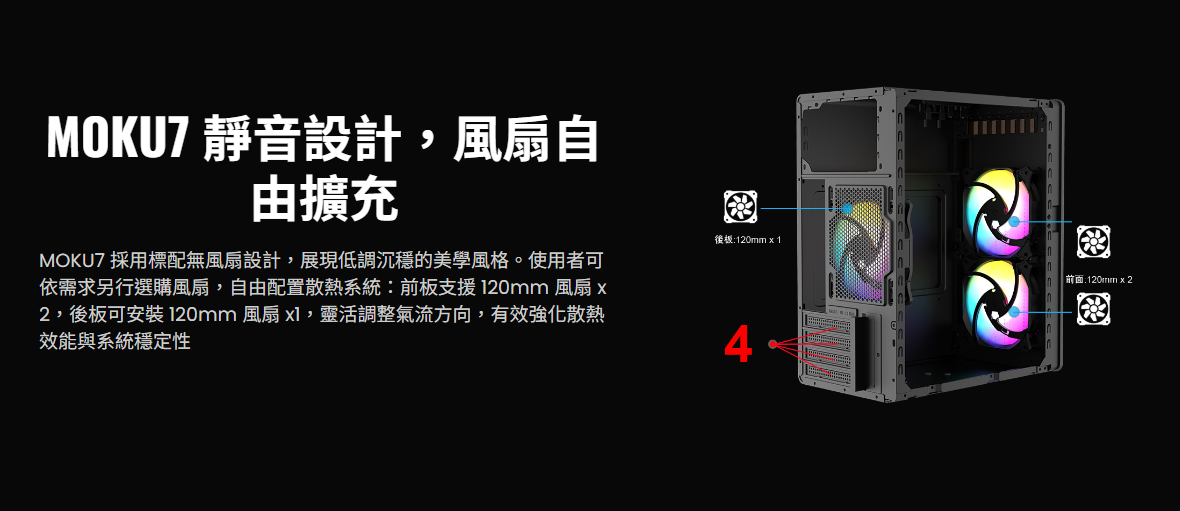 產品型號: MOKU7 主機板支持:M-ATX CPU限高:165mm VGA限長:270mm 硬碟位:支持SSD x 2 或 SSD x 1+HDD x 1 風扇位: 前部120mm*2(選配) 後部120mm*1(選配) 產品尺寸:300*180*355mm