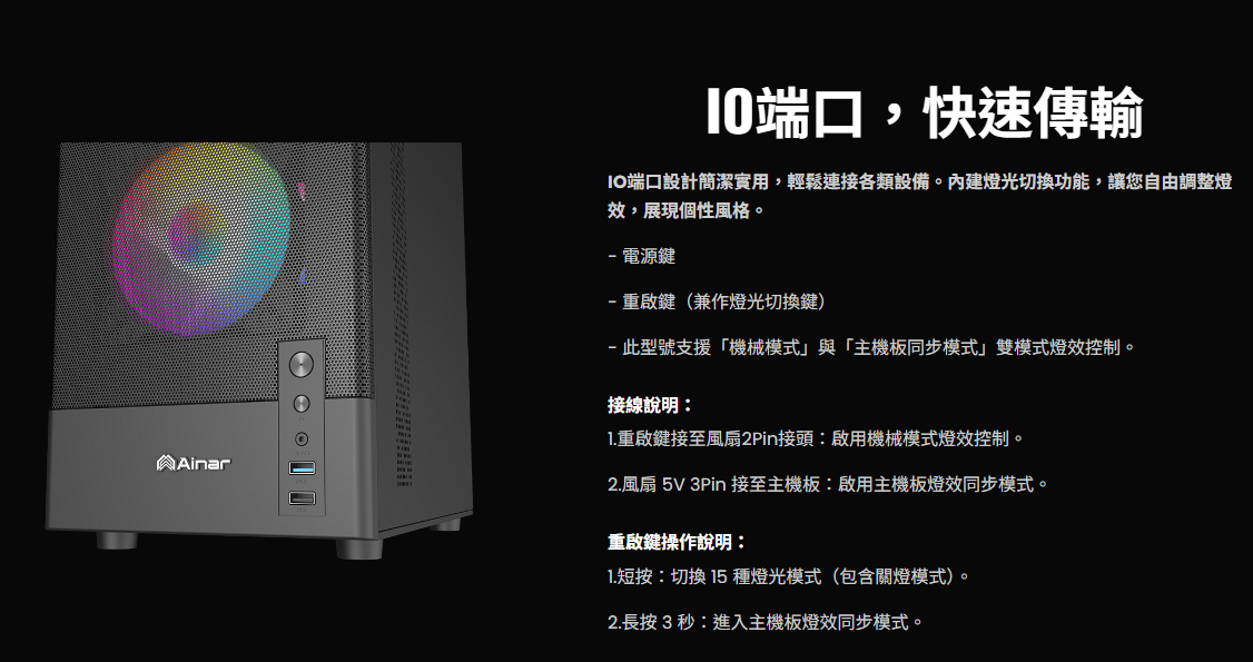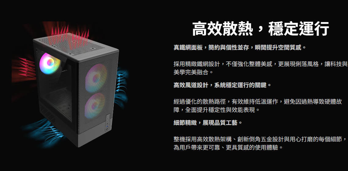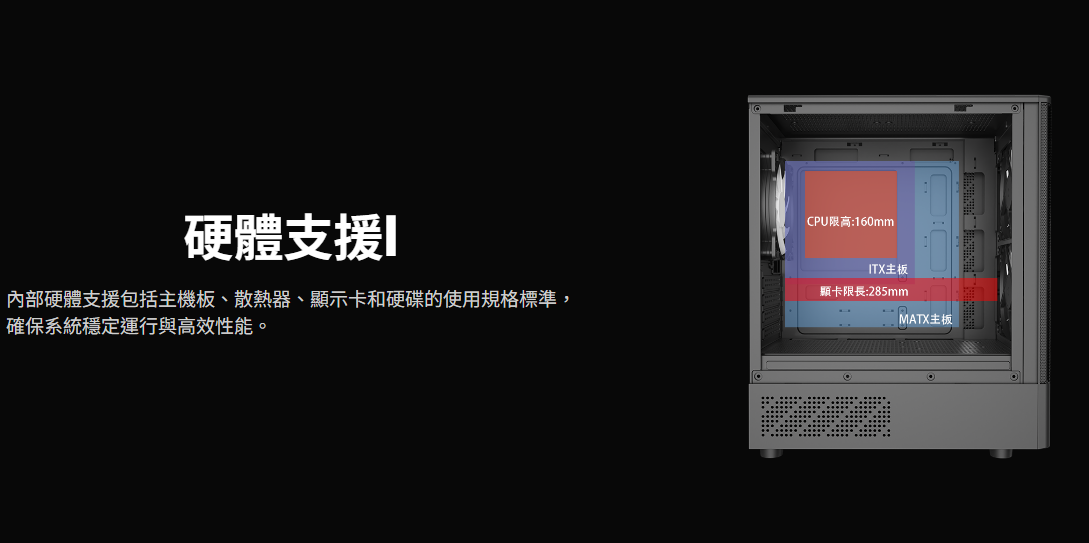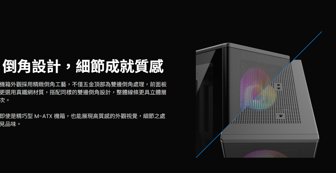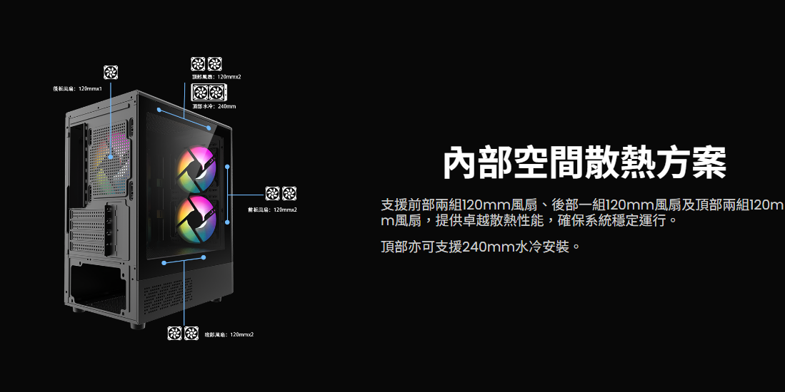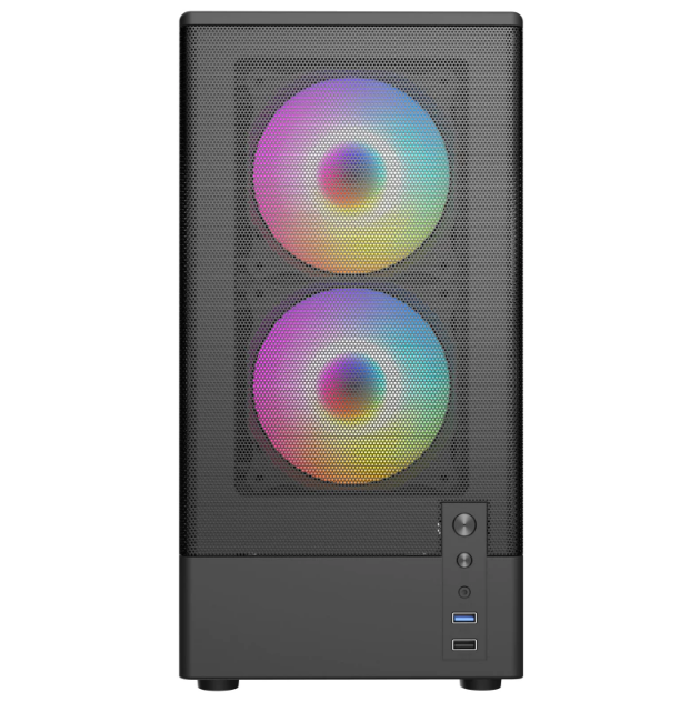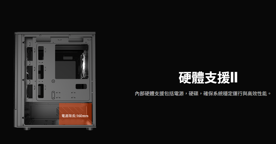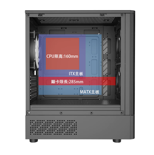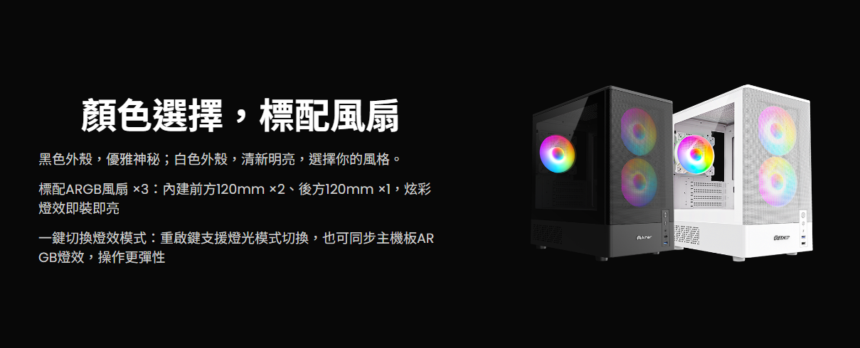 產品型號:X02B/X02W 主機板支持: M-ATX CPU限高:160mm VGA限長:285mm 硬碟位SSD*2 OR HDD*1/SSD*1 OR HDD*2 風扇位: (重啟鈕可關閉燈光及切換燈光顏色) 前板120mm*2 (標配120mm ARGB風扇*2) 後板120mm*1 (標配120mm ARGB風扇*1) 頂板120mm*2 (選配) 水冷支持:頂部240mm 產品尺寸:325X197X387mm