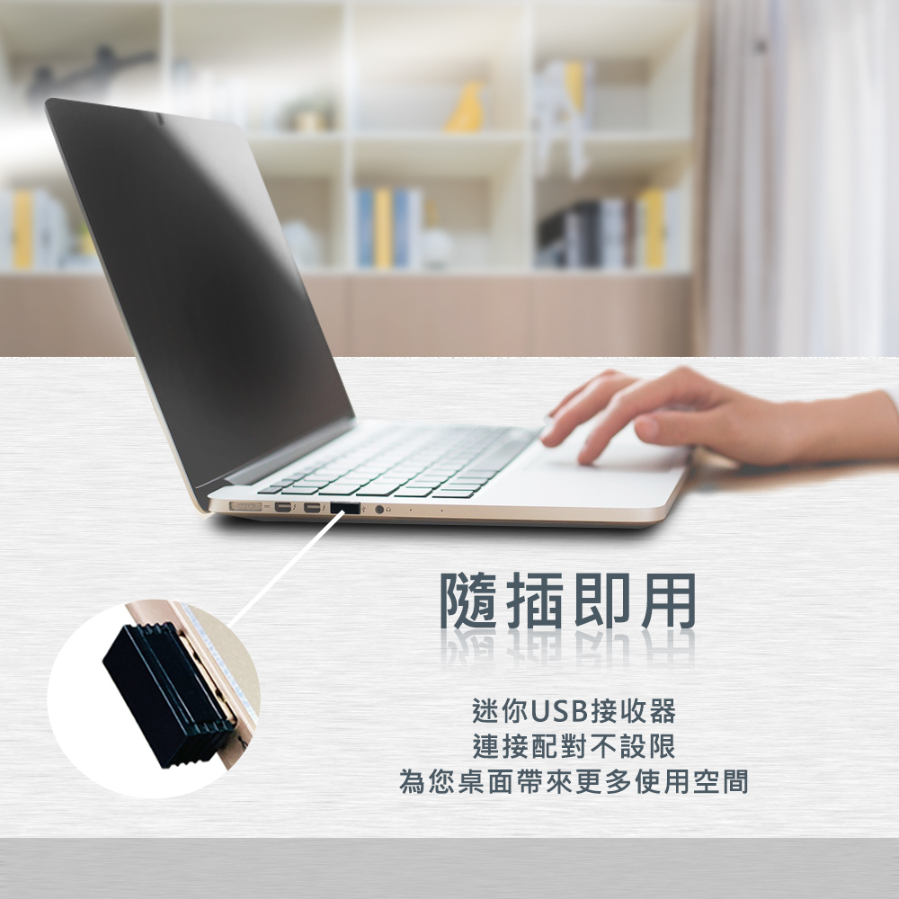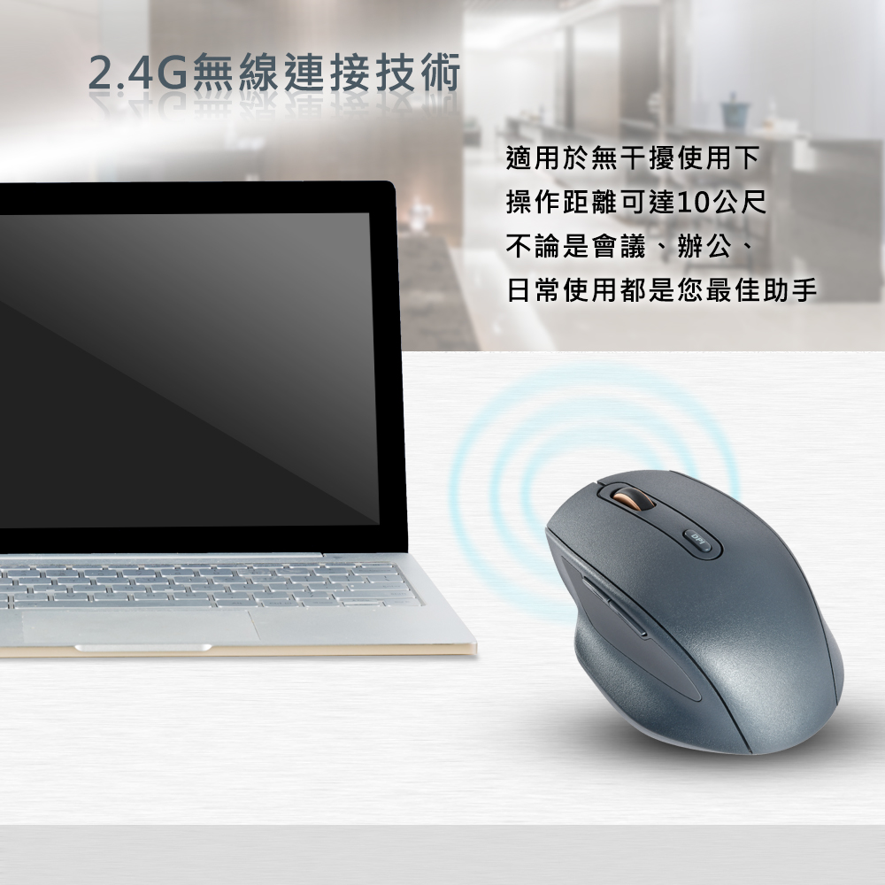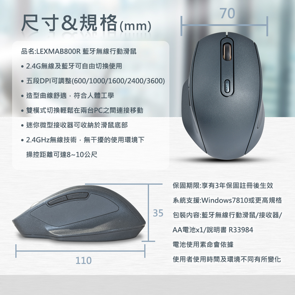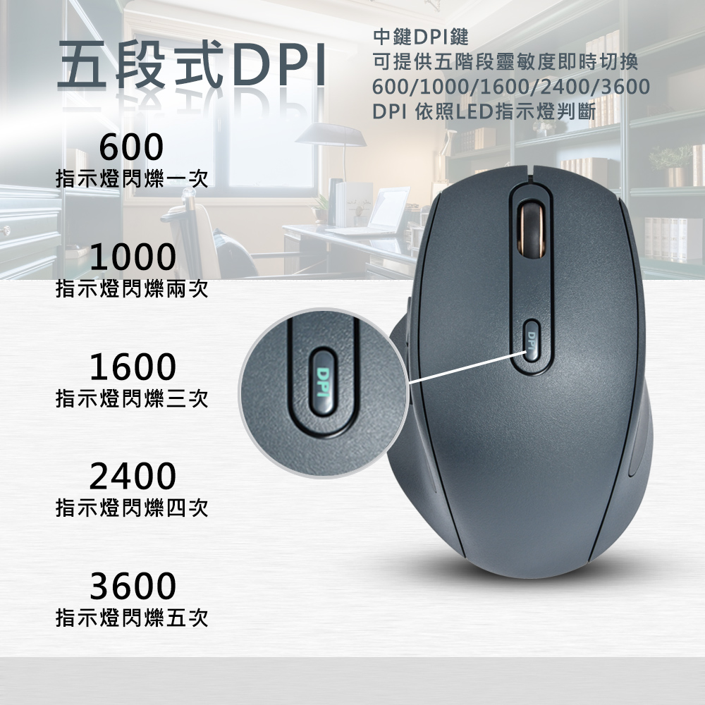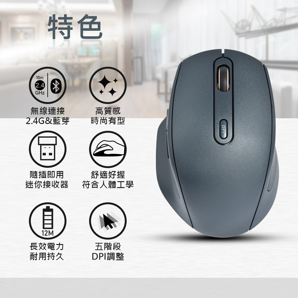 2.4G無線及藍牙可自由切換使用1600 DPI設計,五鍵式設計 五段式DPI可調整(600/1000/1600/2400/3600) USB即插即用,舒適便攜 造型曲線舒適,符合人體工學 雙模式切換,可輕鬆在兩台PC之間連接移動 迷你微型接收器可收納於滑鼠底部 2.4GHz無線技術,無干擾的使用環境下操控距離可達8~10公尺