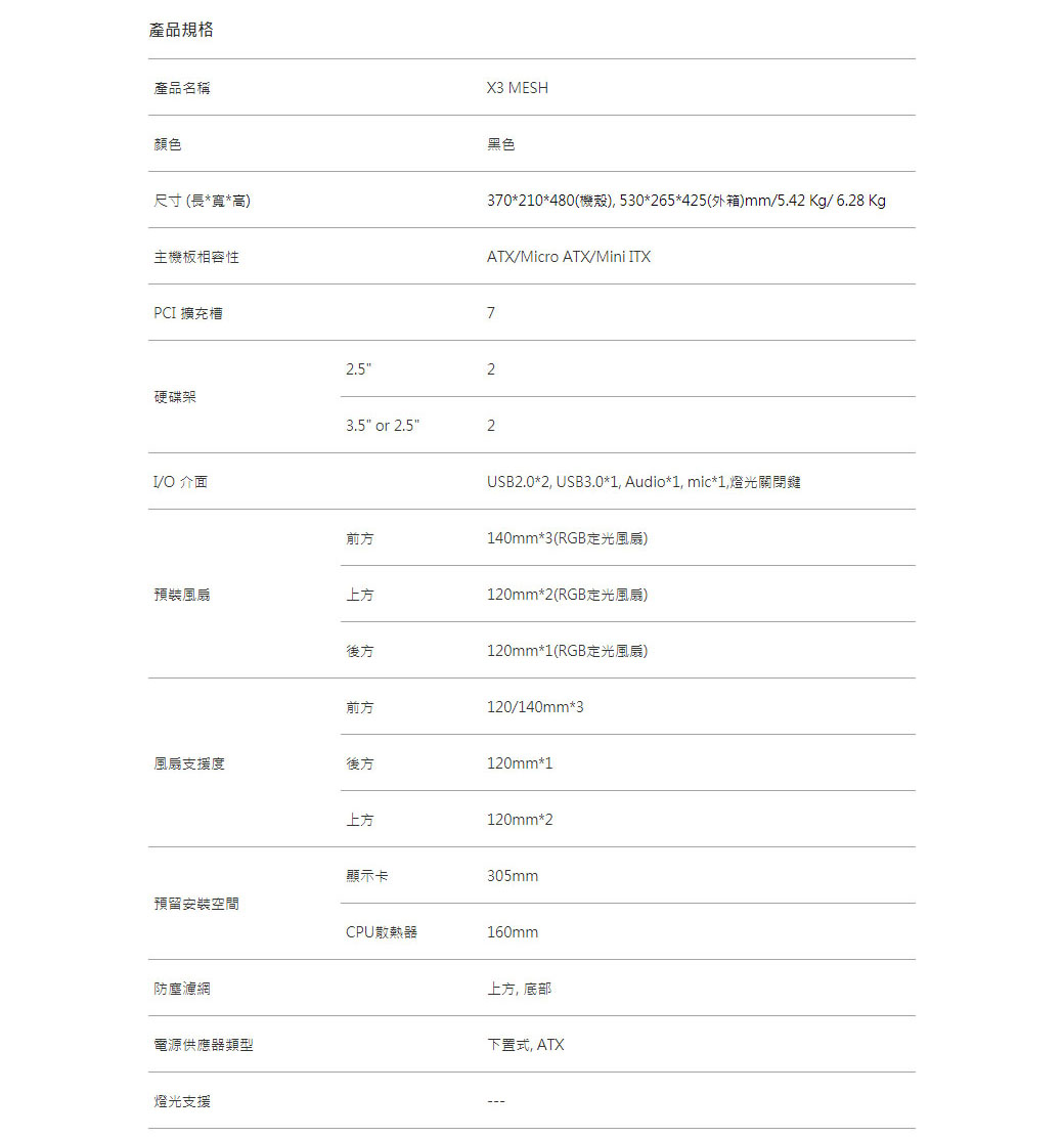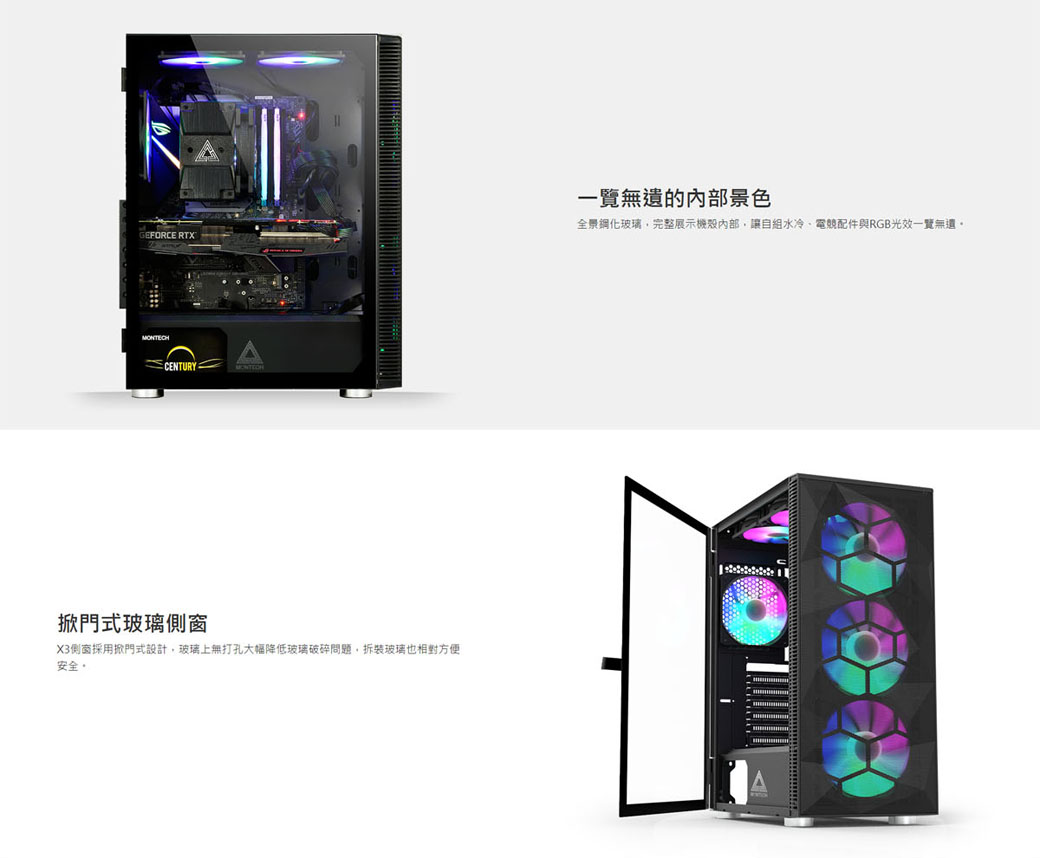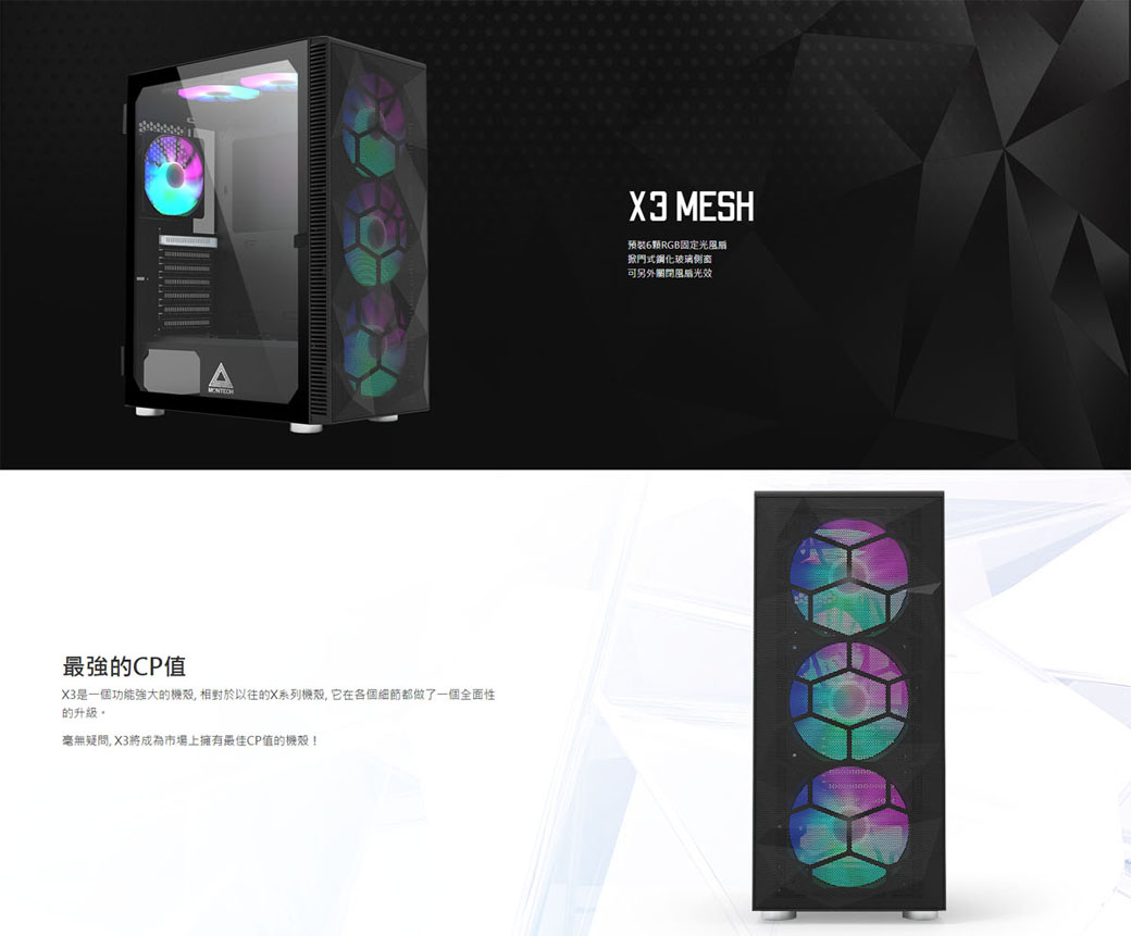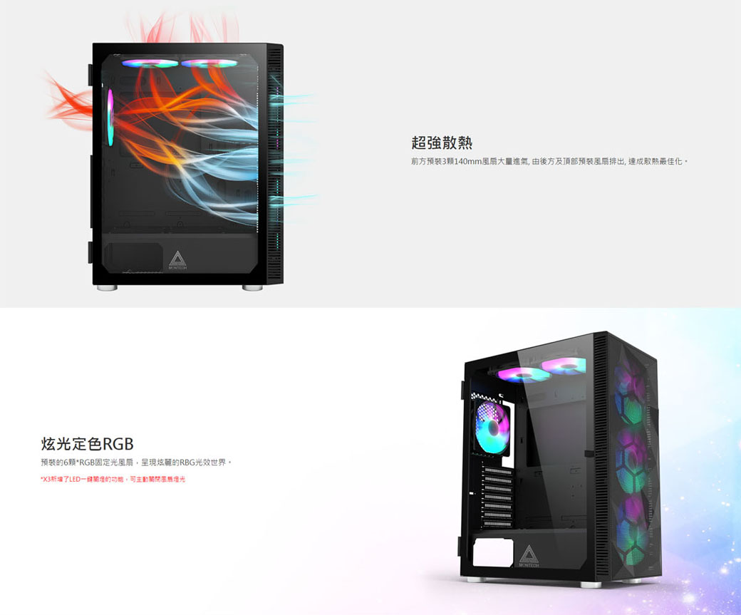 預裝6顆RGB固定光風扇 掀門式鋼化玻璃側窗 可另外關閉風扇光效 X3是一個功能強大的機殼, 相對於以往的X系列機殼, 它在各個細節都做了一個全面性的升級。 毫無疑問, X3將成為市場上擁有最佳CP值的機殼!