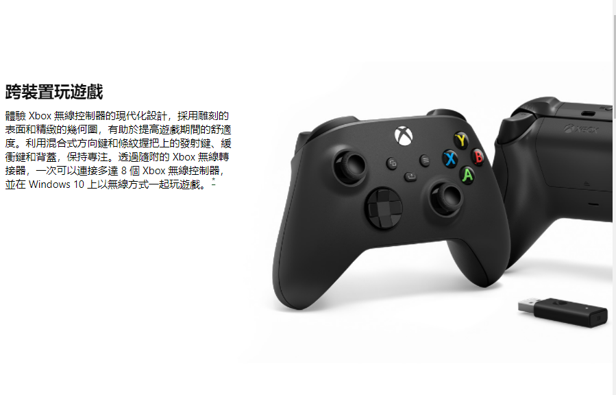 連線能力 使用 Xbox 無線連線到 Xbox 主機。使用藍牙或透過適用於 Windows 10 的 Xbox 無線配接器無線連接到 Windows 10 電腦、平板電腦,iOS 和 Android 裝置。*