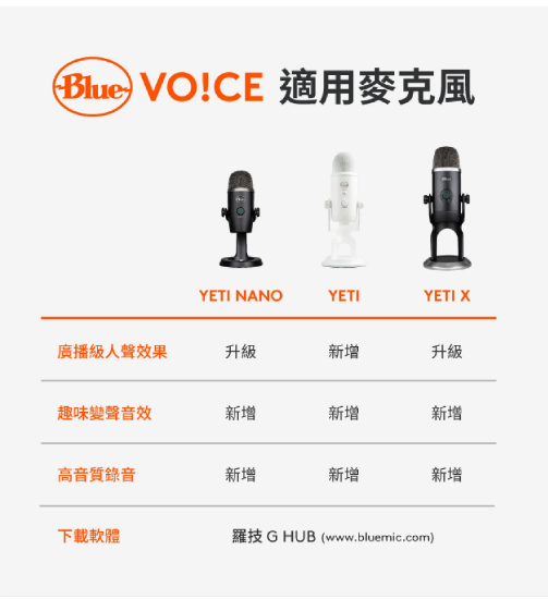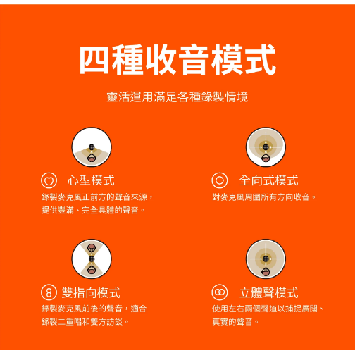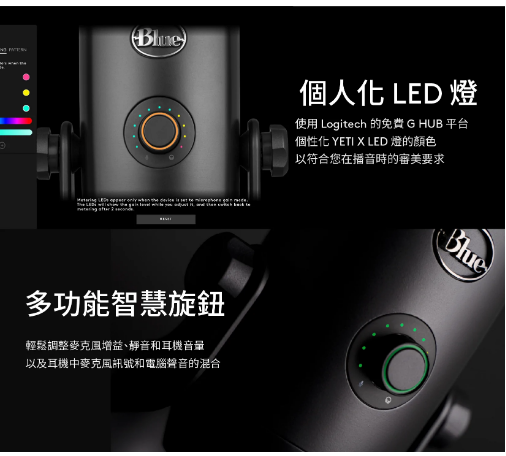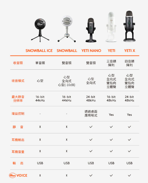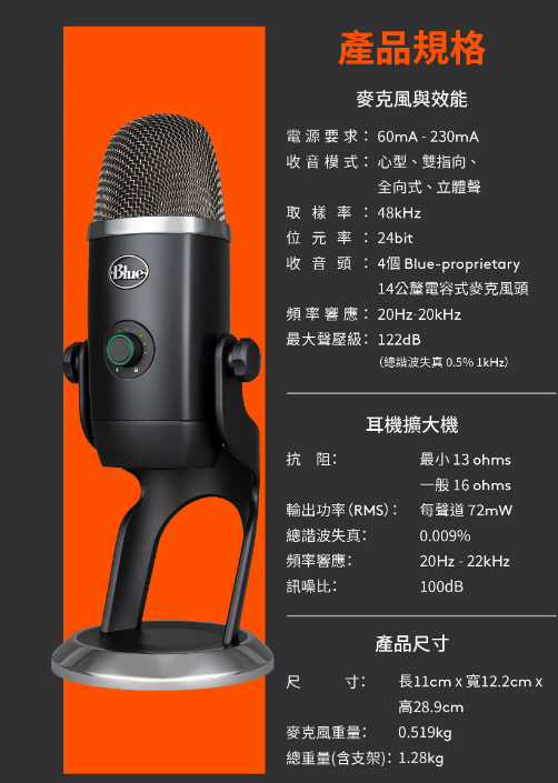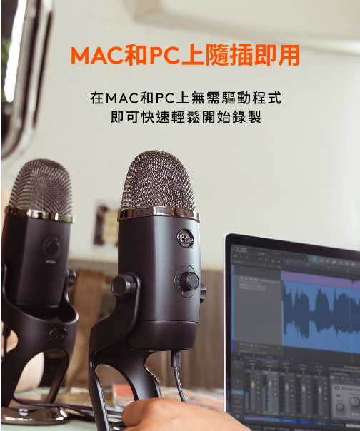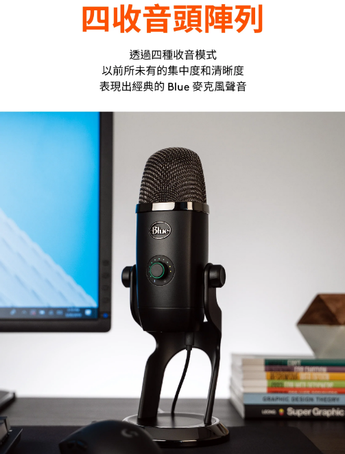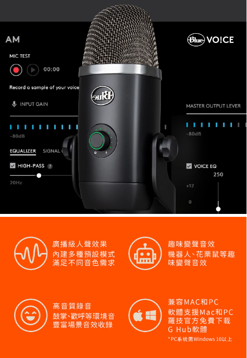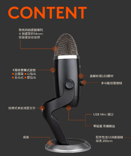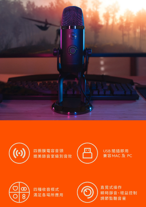 1. 四收音頭電容器陣列更集中和清晰的聲音 2. 高解析度 LED 計量表輕鬆調整音量等級 3. Blue VO!CE 廣播語音效果設定 4. 四種收音方式:心型、全向、雙指向和立體聲