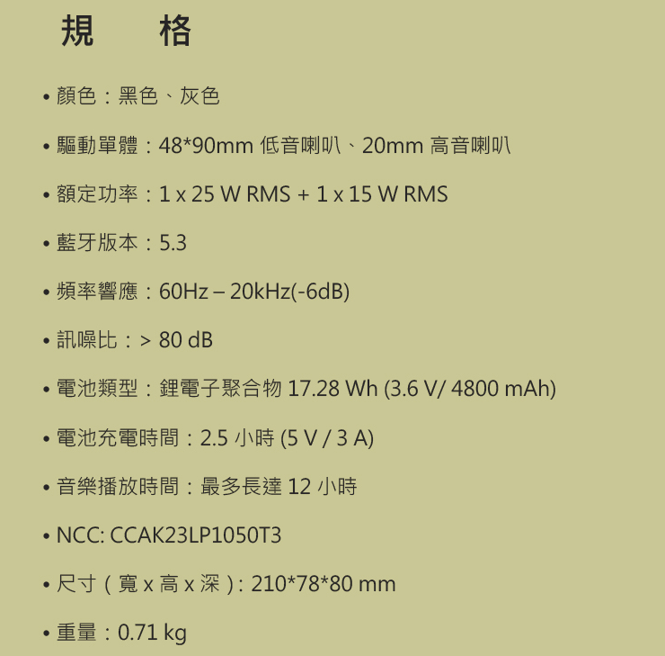 ★時尚外觀 高品質設計 ★隨時聽見音樂 ★藍牙串流播放長達12小時 ★可與第二個Luna揚聲器配對 實現立體聲音效 ★使用高比例的再生材料 降低環境影響 ★防水防塵等級IP67