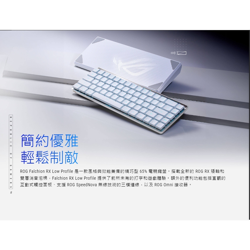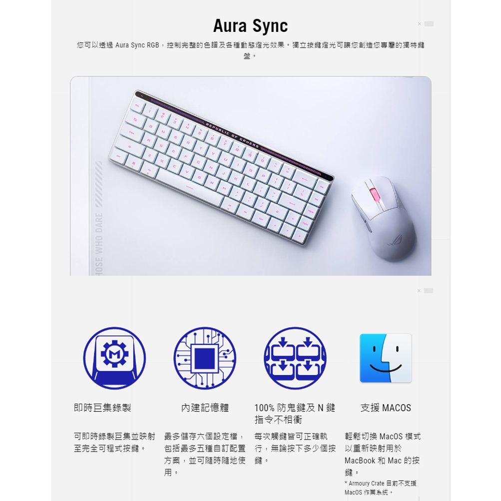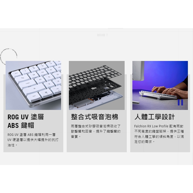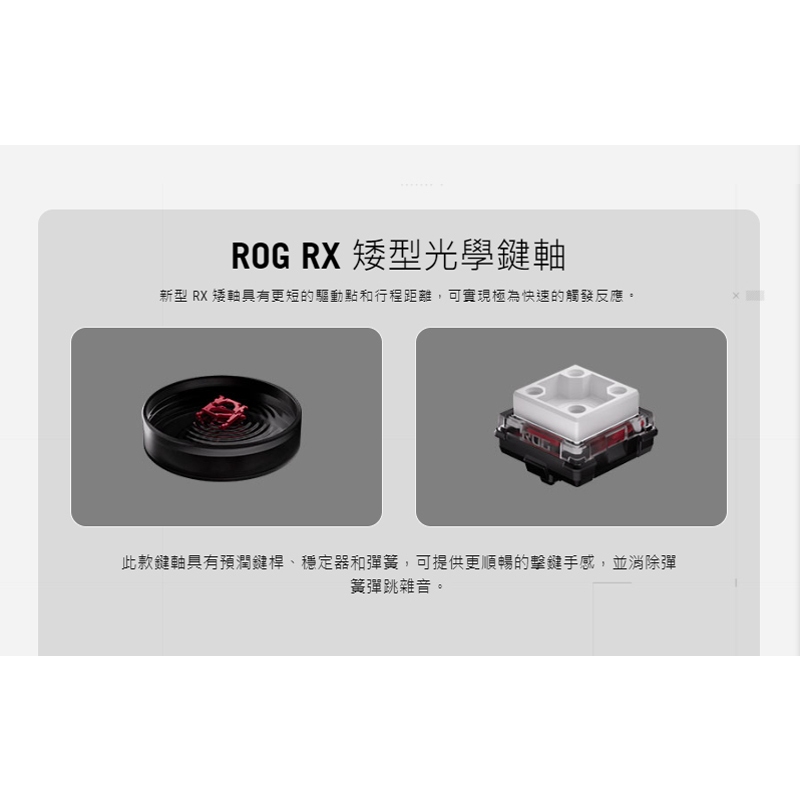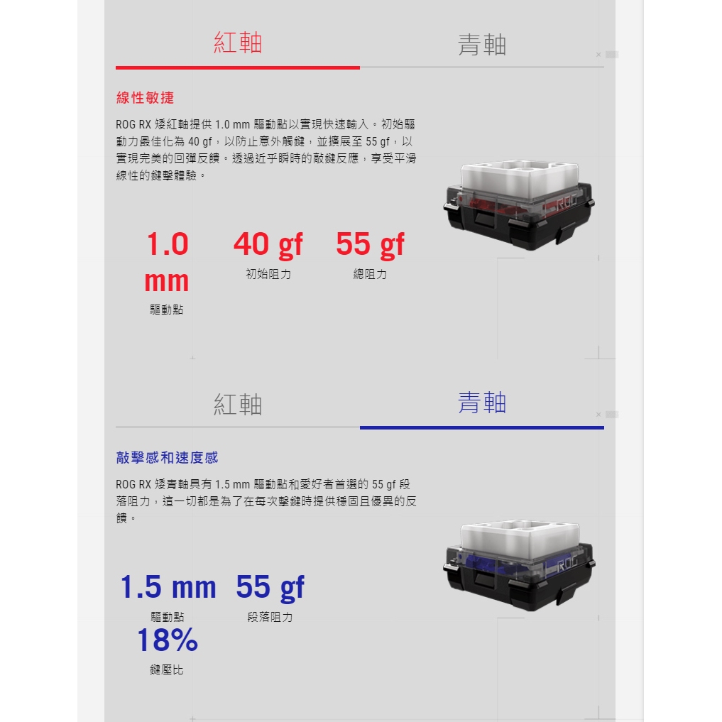 ROG RX 光學矮軸: 預潤的 RX 紅軸和青軸具備中央 LED 燈校,提供穩定不晃動且瞬時回饋的鍵擊體驗。