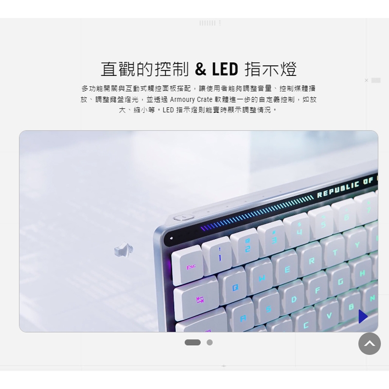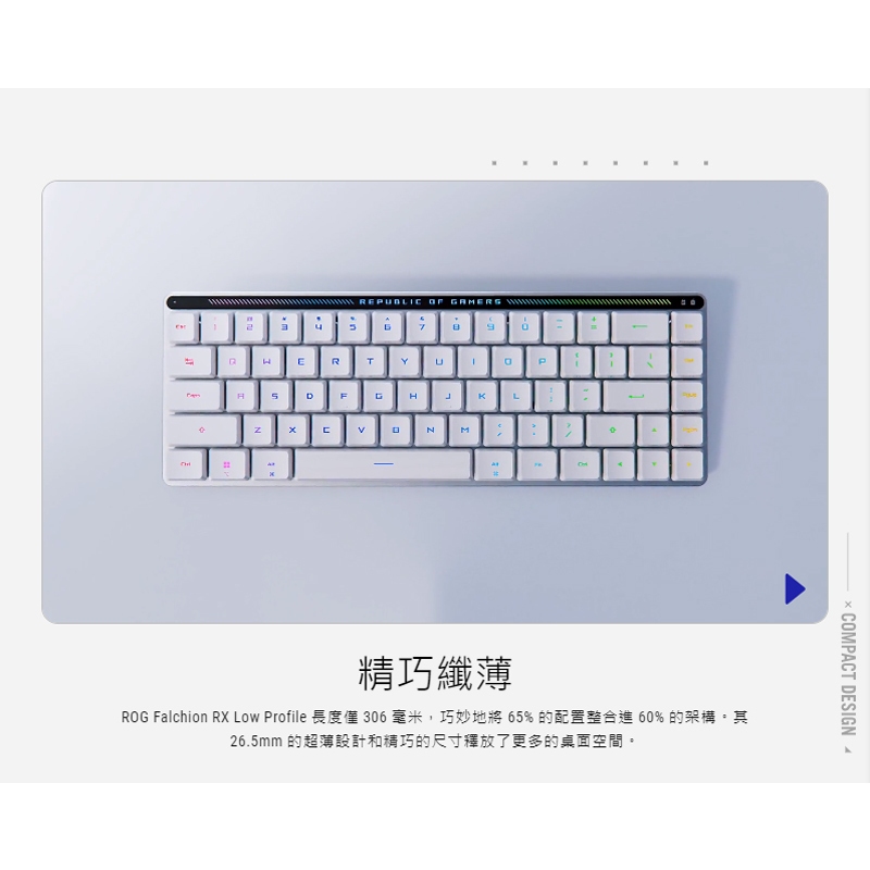 精薄外型: 65% 鍵盤精巧的配置在 60% 的架構中,巧妙地整合箭頭與方向鍵,並擁有極薄的 26.5mm 鍵盤高度。