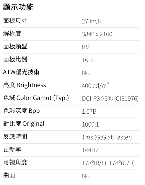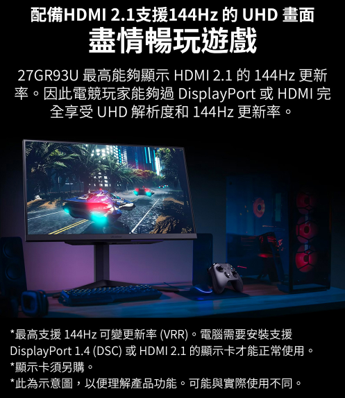 27 吋 LG UltraGear™ UHD (3840x2160) 顯示器 144Hz 更新率 IPS 1ms (GtG) 反應時間 VESA DisplayHDR™ 400 / DCI-P3 95% (Typ.) NVIDIA® G-SYNC® 相容 AMD FreeSync™ Premium