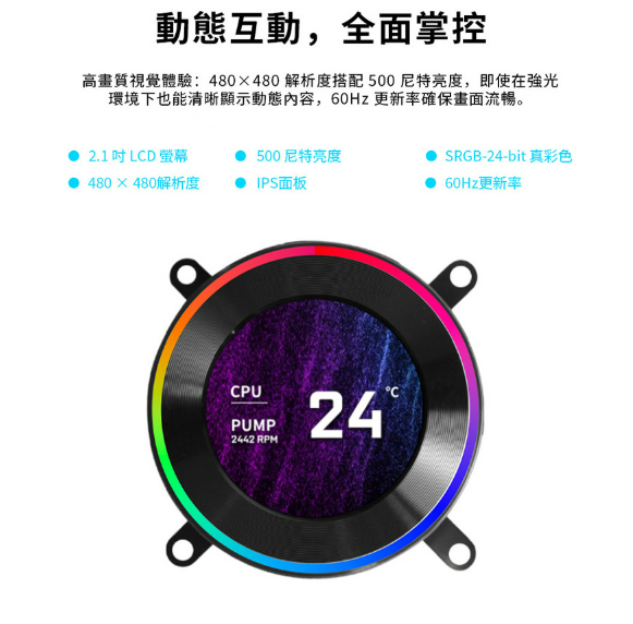 ◆水冷頭LCD尺寸:2.1 吋 IPS (解析度:480 x 480)