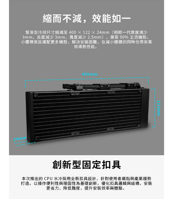 ◆產品尺寸:水冷頭 89 × 89 × 69 mm / 水冷排 400 x 122 x 24 mm