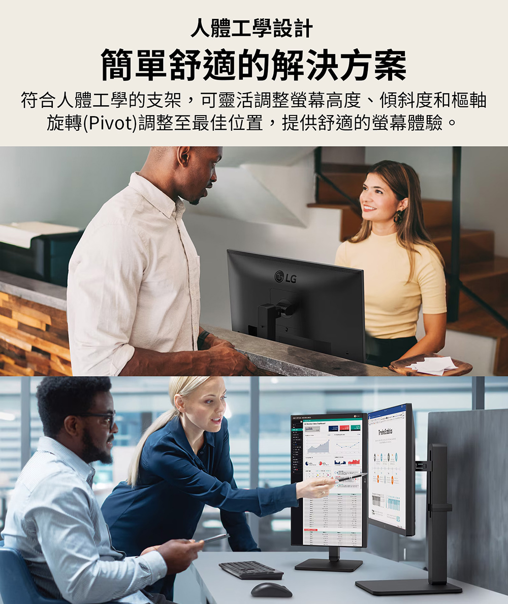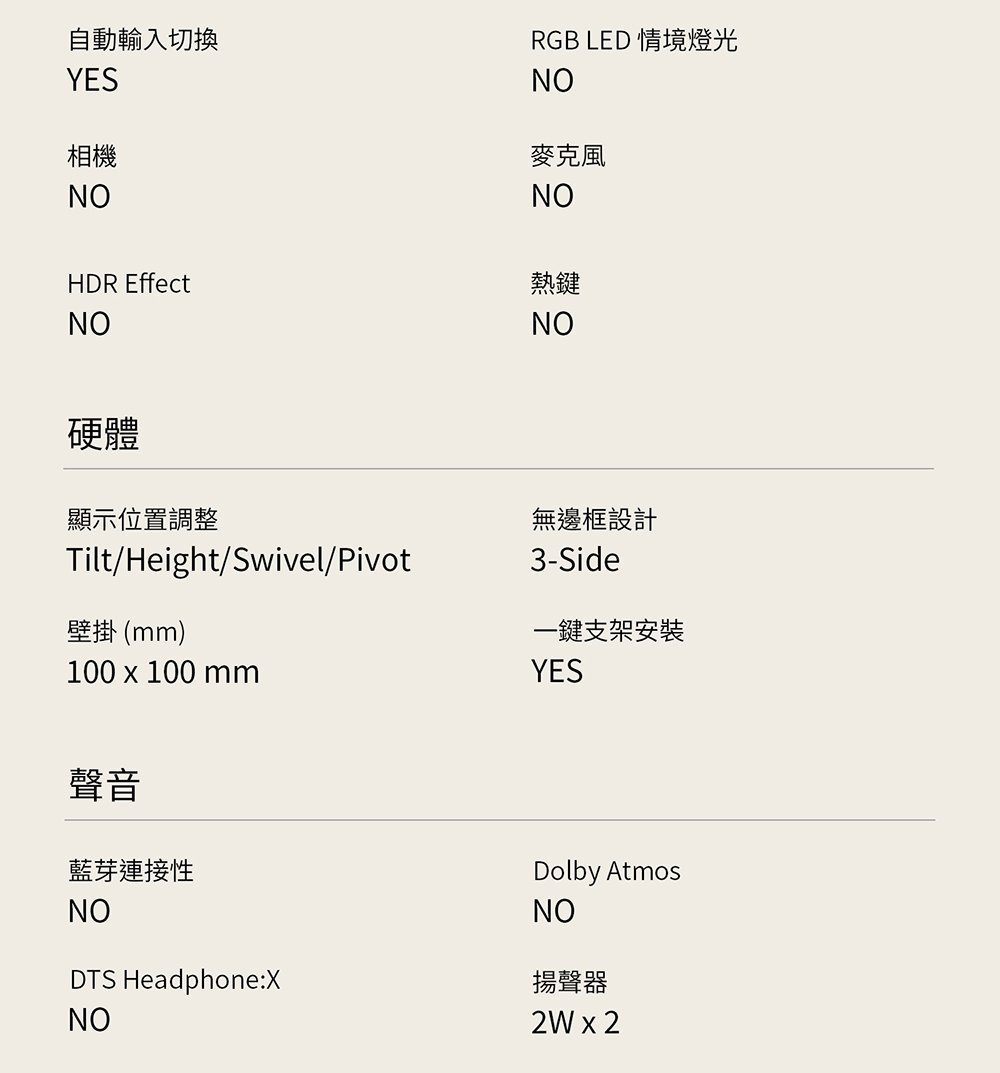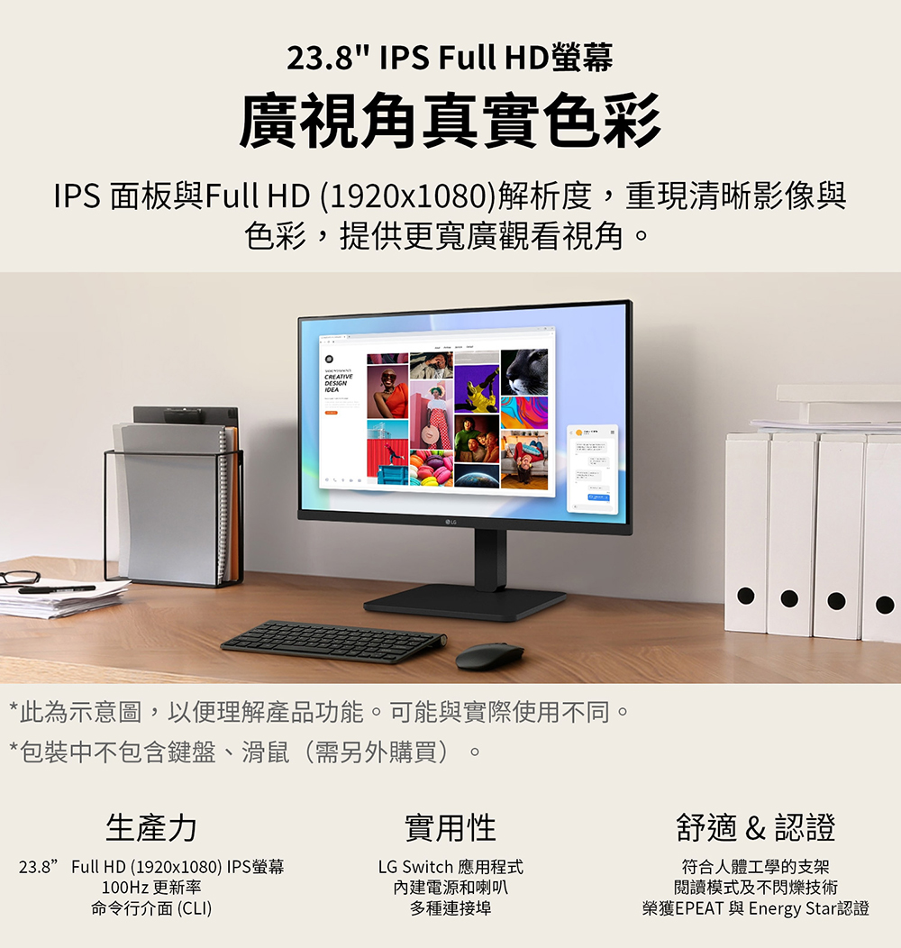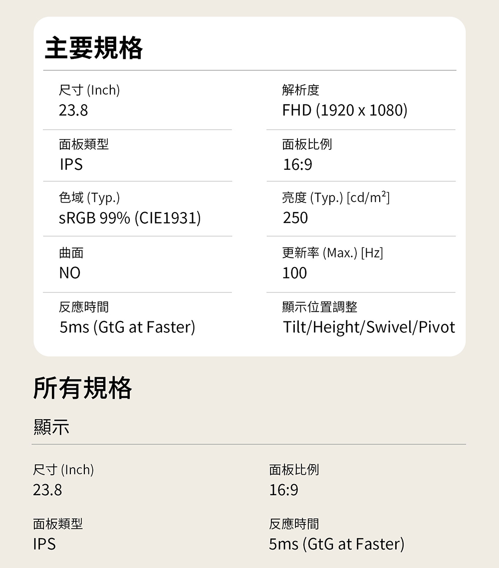 23.8吋 Full HD (1920x1080) IPS護眼螢幕 內建電源和內建喇叭 / 100Hz 高更新率,畫面清晰流暢 可調整傾斜/高度/旋轉/樞軸旋轉 (雙向) 人體工學支架