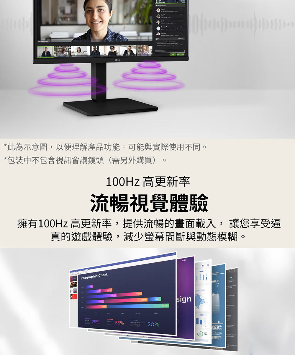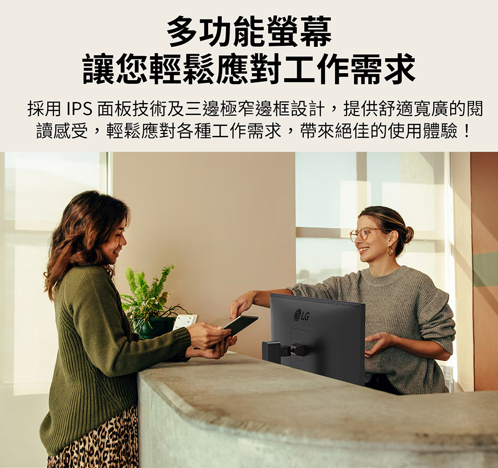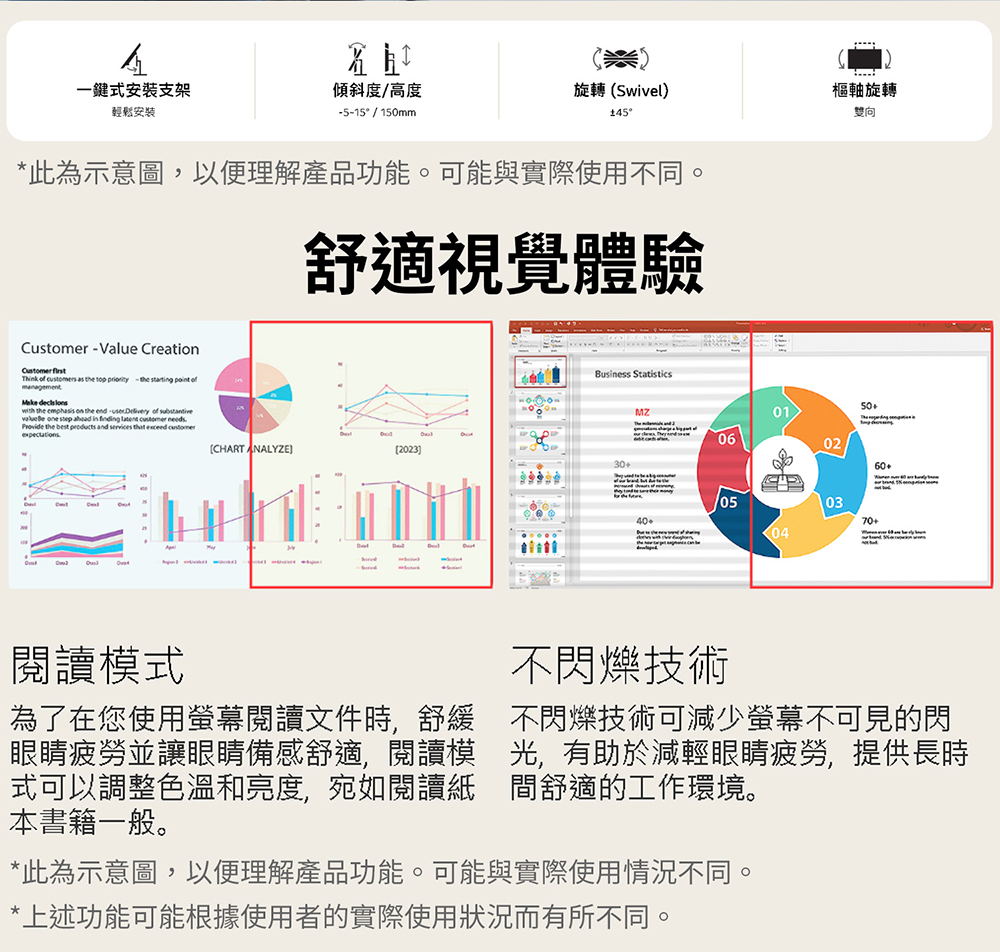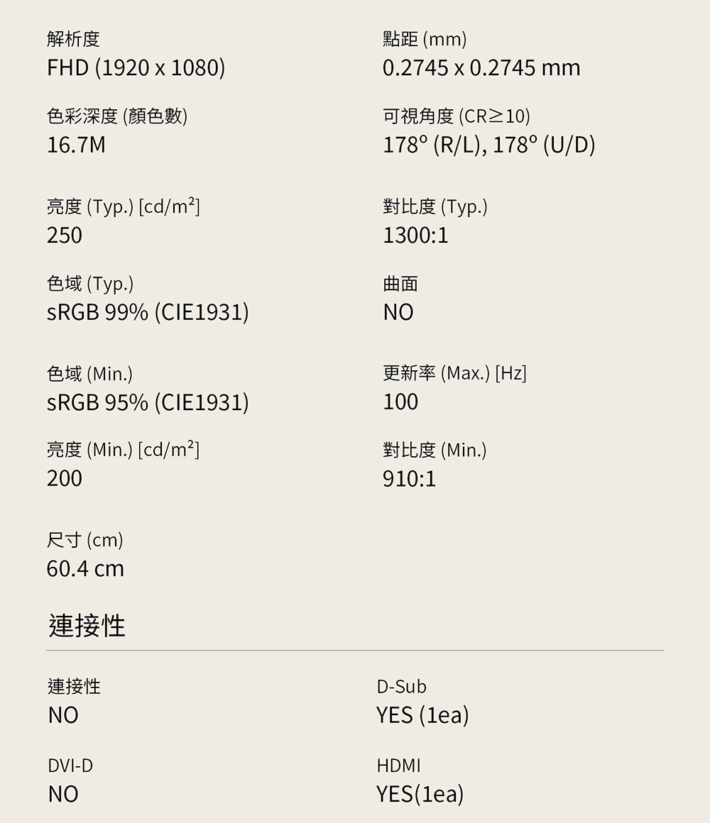 23.8吋 Full HD (1920x1080) IPS護眼螢幕 內建電源和內建喇叭 / 100Hz 高更新率,畫面清晰流暢 可調整傾斜/高度/旋轉/樞軸旋轉 (雙向) 人體工學支架