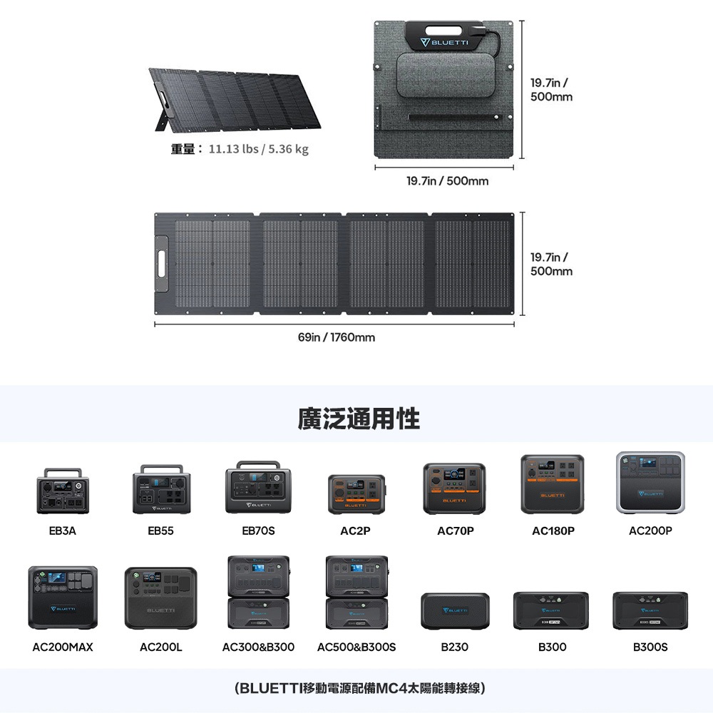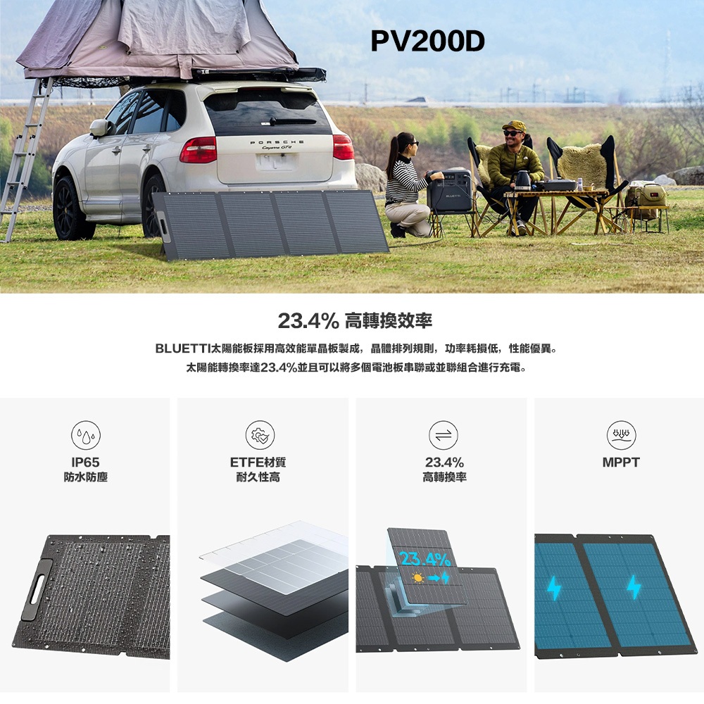 最大功率:200W 太陽能電池層壓:ETFE(乙烯四氟乙烯) 太陽能電池種類:單晶矽 電池效率:高達23.4% 開路電壓(OCV):24.6V 短路電流(Isc):10.8A 連接器:標準 MC4 連接器 重量:8.14 kg 尺寸(展開):585 x 608 x 45mm 尺寸(折疊):608 x 2105 mm