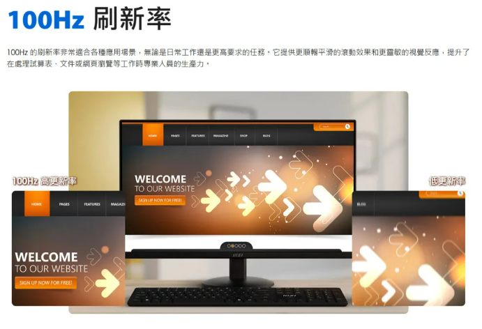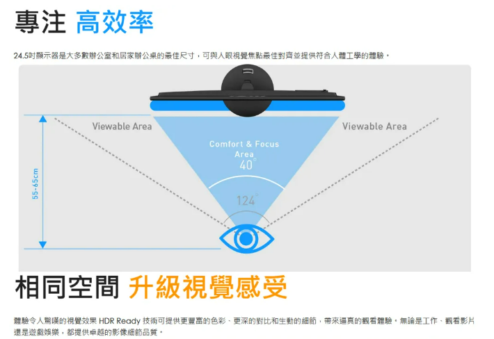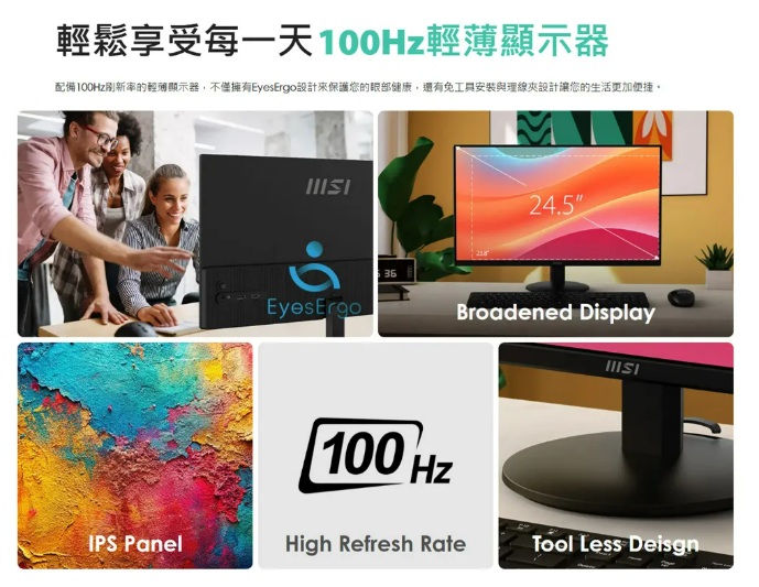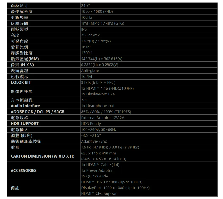 24.5” 1920 x 1080 (FHD) IPS 100Hz刷新率 / 1ms HDMI、D-Sub(VGA)連接埠